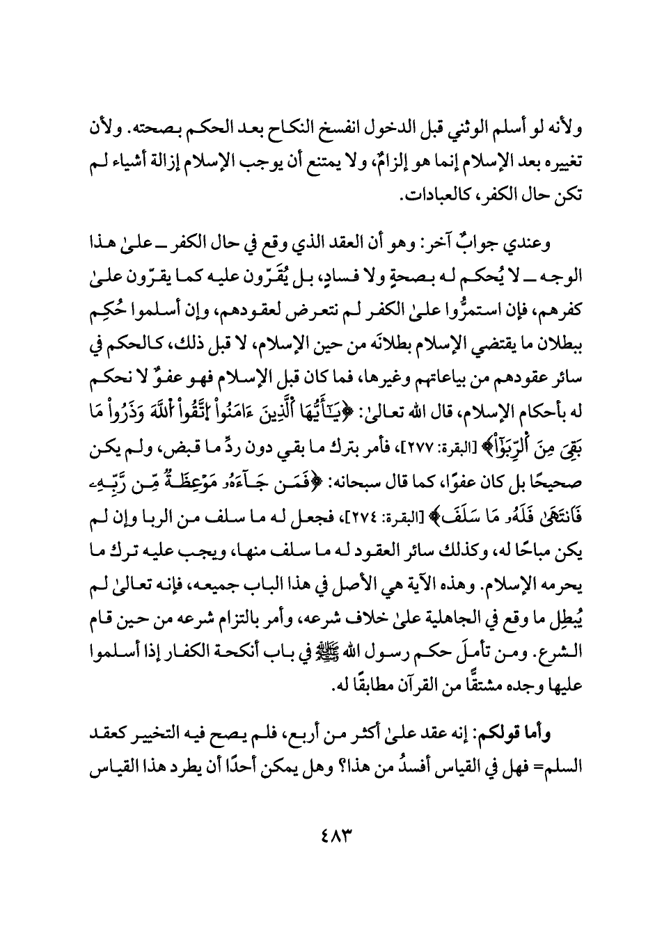 وعندي جوابٌ آخر: وهو أن العقد الذي وقع في حال الكفر ــ على هذا الوجه ــ لا يُحكم له بصحةٍ ولا فسادٍ، بل يُقَرّون عليه كما يقرّون على كفرهم، فإن استمرُّوا على الكفر لم نتعرض لعقودهم، وإن أسلموا حُكِم ببطلان ما يقتضي الإسلام بطلانَه من حين الإسلام، لا قبل ذلك، كالحكم في سائر عقودهم من بياعاتهم وغيرها، فما كان قبل الإسلام فهو عفوٌ لا نحكم له بأحكام الإسلام، قال الله تعالى: {يَاأَيُّهَا اَلَّذِينَ ءَامَنُوا اُتَّقُوا اُللَّهَ وَذَرُوا مَا بَقِيَ مِنَ اَلرِّبَوا} [البقرة: ٢٧٧]، فأمر بترك ما بقي دون ردِّ ما قبض، ولم يكن صحيحًا بل كان عفوًا، كما قال سبحانه: {فَمَنْ جَاءَهُ مَوْعِظَةٌ مِنْ رَبِّهِ فَانْتَهَى فَلَهُ مَا سَلَفَ} [البقرة: ٢٧٤]، فجعل له ما سلف من الربا وإن لم يكن مباحًا له، وكذلك سائر العقود له ما سلف منها، ويجب عليه ترك ما يحرمه الإسلام. وهذه الآية هي الأصل في هذا الباب جميعه، فإنه تعالى لم يُبطِل ما وقع في الجاهلية على خلاف شرعه، وأمر بالتزام شرعه من حين قام الشرع. ومن تأملَ حكم رسول الله - صلى الله عليه وسلم - في باب أنكحة الكفار إذا أسلموا عليها وجده مشتقًّا من القرآن مطابقًا له.
