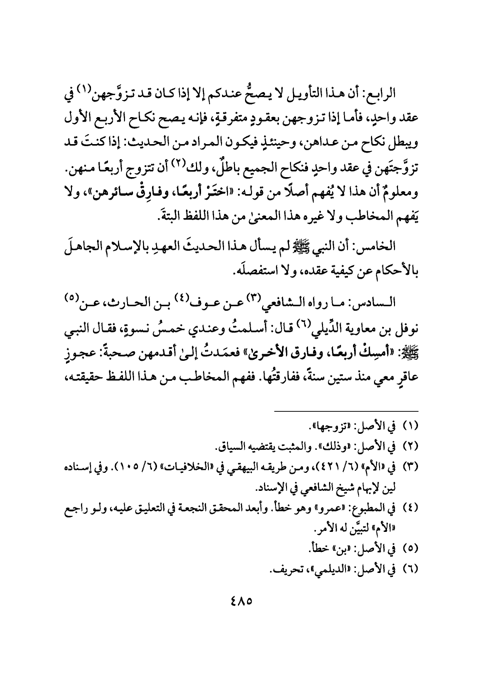الرابع: أن هذا التأويل لا يصحُّ عندكم إلا إذا كان قد تزوَّجهن (¬١) في عقد واحدٍ، فأما إذا تزوجهن بعقودٍ متفرقةٍ، فإنه يصح نكاح الأربع الأول ويبطل نكاح من عداهن، وحينئذٍ فيكون المراد من الحديث: إذا كنتَ قد تزوَّجتَهن في عقد واحدٍ فنكاح الجميع باطلٌ، ولك (¬٢) أن تتزوج أربعًا منهن. ومعلومٌ أن هذا لا يُفهم أصلًا من قوله: "اختَرْ أربعًا، وفارِقْ سائرهن"، ولا يَفهم المخاطب ولا غيره هذا المعنى من هذا اللفظ البتةَ.