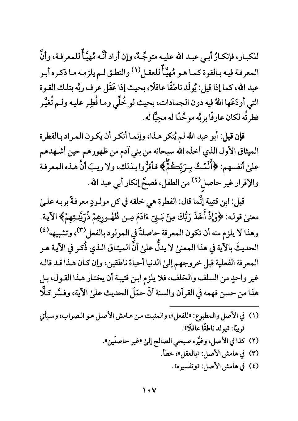 قيل: ابن قتيبة إنَّما قال: الفطرة هي خلقه في كل مولودٍ معرفةً بربه على معنى قوله: {وَإِذْ أَخَذَ رَبُّكَ مِن بَنِي آدَمَ مِن ظُهُورِهِمْ ذُرِّيَّاتِهِمْ} الآية. وهذا لا يلزم منه أن تكون المعرفة حاصلةً في المولود بالفعل (¬٣)، وتشبيهه (¬٤) الحديثَ بالآية في هذا المعنى لا يدلُّ على أنَّ الميثاق الذي ذُكر في الآية هو المعرفة الفعلية قبل خروجهم إلى الدنيا أحياءً ناطقين، وإن كان هذا قد قاله غير واحدٍ من السلف والخلف، فلا يلزم ابن قتيبة أن يختار هذا القول، بل هذا من حسن فهمه في القرآن والسنة أنْ حمَلَ الحديث على الآية، وفسَّر كلًّا