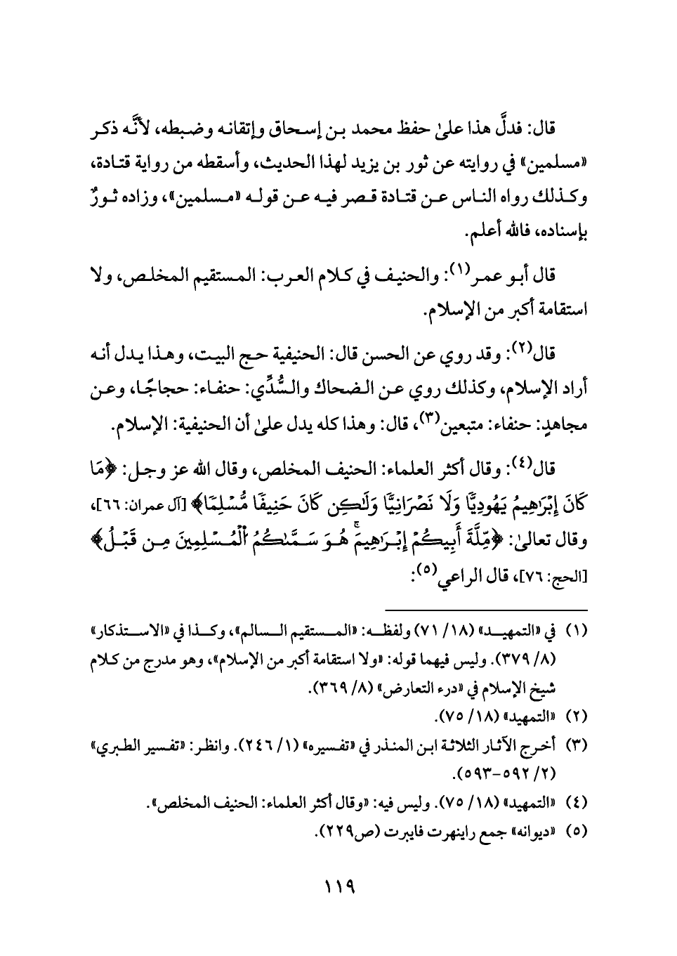 (¬٤) «التمهيد» (١٨/ ٧٥). وليس فيه: «وقال أكثر العلماء: الحنيف المخلص».