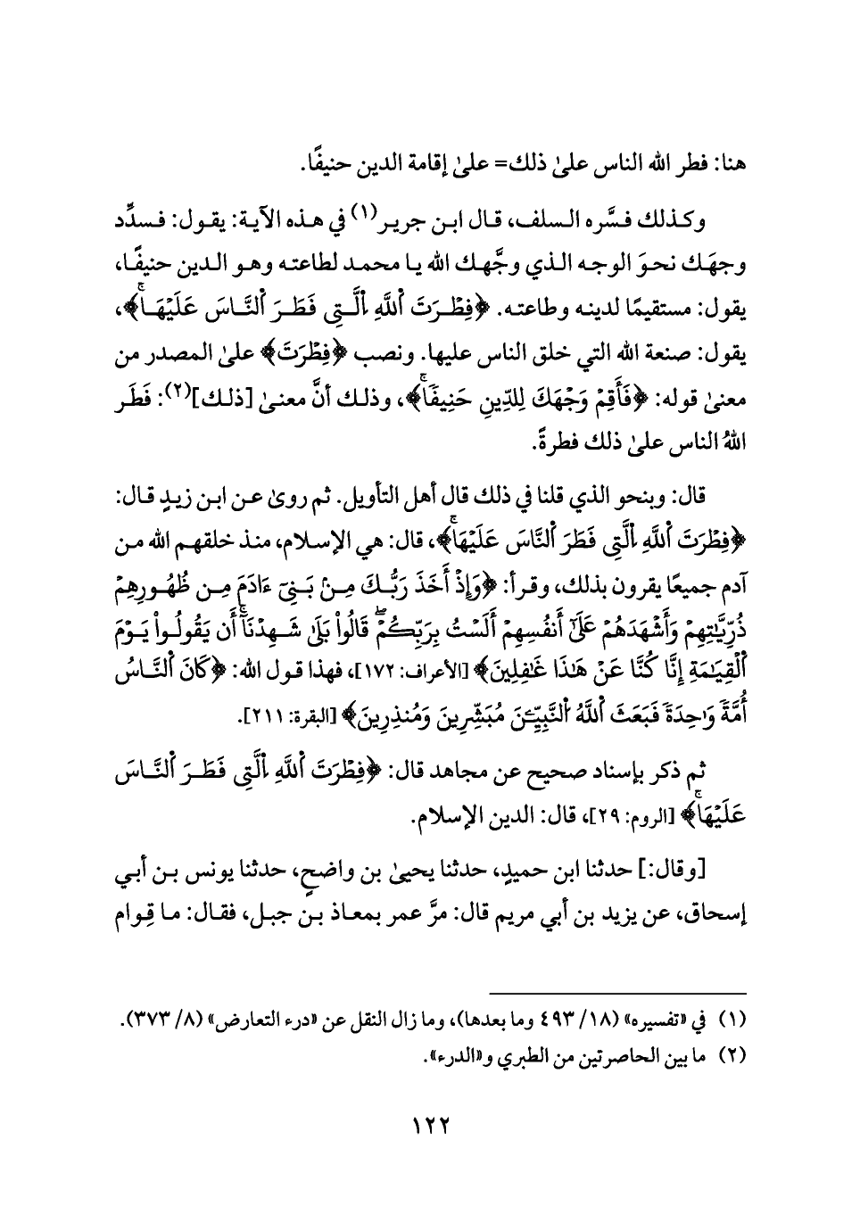 قال: وبنحو الذي قلنا في ذلك قال أهل التأويل. ثم روى عن ابن زيدٍ قال: {فِطْرَتَ اَللَّهِ اِلَّتِي فَطَرَ اَلنَّاسَ عَلَيْهَا}، قال: هي الإسلام، منذ خلقهم الله من آدم جميعًا يقرون بذلك، وقرأ: {وَإِذْ أَخَذَ رَبُّكَ مِن بَنِي آدَمَ مِن ظُهُورِهِمْ ذُرِّيَّاتِهِمْ وَأَشْهَدَهُمْ عَلَى أَنفُسِهِمْ أَلَسْتُ بِرَبِّكُمْ قَالُوا بَلَى شَهِدْنَا أَن يَقُولُوا يَوْمَ اَلْقِيَامَةِ إِنَّا كُنَّا عَنْ هَذَا غَافِلِينَ} [الأعراف: ١٧٢]، فهذا قول الله: {كَانَ اَلنَّاسُ أُمَّةً وَاحِدَةً فَبَعَثَ اَللَّهُ اُلنَّبِيِّينَ مُبَشِّرِينَ وَمُنذِرِينَ} [البقرة: ٢١١].