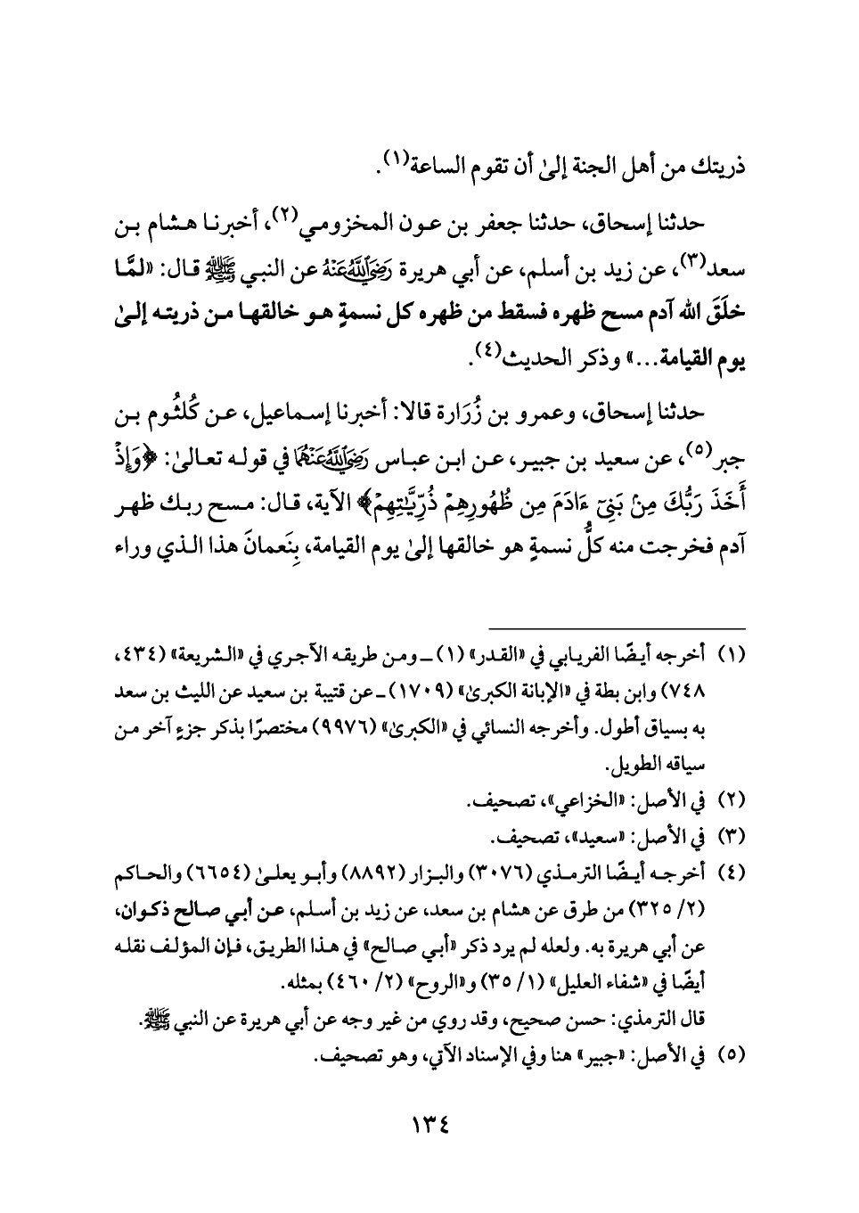 حدثنا إسحاق، حدثنا جعفر بن عون المخزومي (¬٢)، أخبرنا هشام بن سعد (¬٣)، عن زيد بن أسلم، عن أبي هريرة - رضي الله عنه - عن النبي - صلى الله عليه وسلم - قال: «لمَّا خلَقَ الله آدم مسح ظهره فسقط من ظهره كل نسمةٍ هو خالقها من ذريته إلى يوم القيامة ... » وذكر الحديث (¬٤).