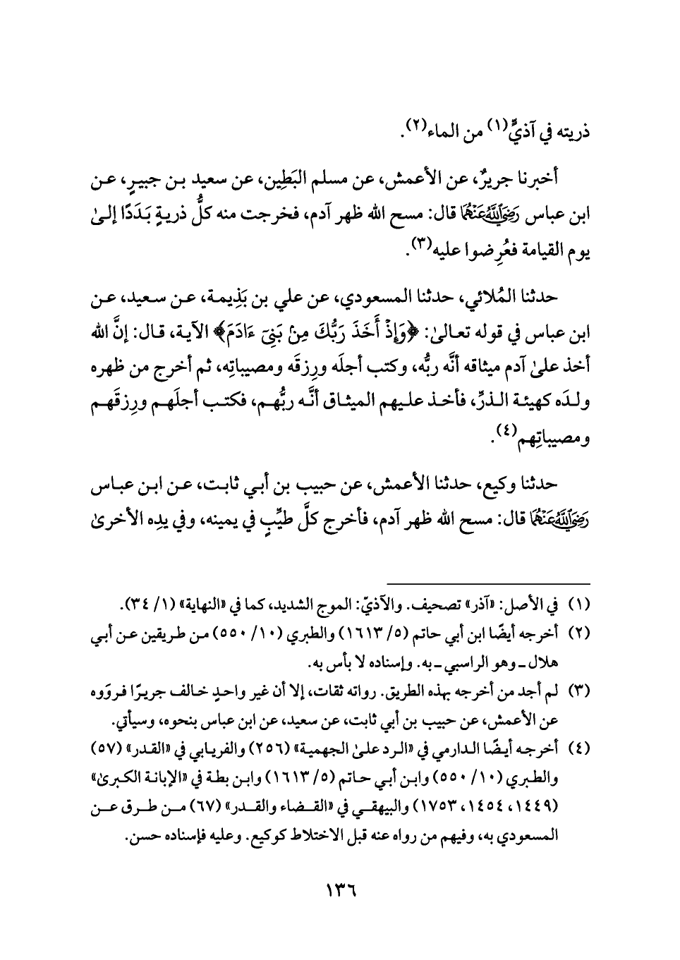 أخبرنا جريرٌ، عن الأعمش، عن مسلم البَطِين، عن سعيد بن جبيرٍ، عن ابن عباس - رضي الله عنهما - قال: مسح الله ظهر آدم، فخرجت منه كلُّ ذريةٍ بَدَدًا إلى يوم القيامة فعُرِضوا عليه (¬٣).