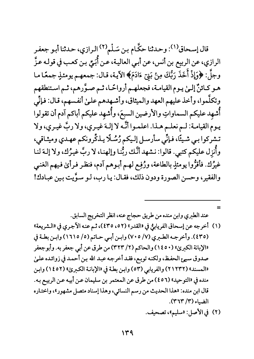 (¬١) أخرجه عن إسحاق الفريابيُّ في «القدر» (٥٢، ٤٣٥)، ثم عنه الآجري في «الشريعة» (٤٣٥). وأخرجه الطبري (٧/ ٧٠٥) وابن أبي حاتم (٥/ ١٦١٥) وابن بطة في «الإبانة الكبرى» (١٤٥٠) والحاكم (٢/ ٣٢٣) من طرق عن أبي جعفر به. وأبوجعفر صدوق سيئ الحفظ، ولكنه توبع، فقد أخرجه عبد الله بن أحمد في زوائده على «المسند» (٢١٢٣٢) والفريابي (٥٣) وابن بطة في «الإبانة الكبرى» (١٤٥٢) وابن منده في «التوحيد» (٤٥٦) من طرق عن المعتمر بن سليمان عن أبيه عن الربيع به. قال ابن منده: «هذا الحديث من رسم النسائي، وهذا إسناد متصل مشهور»، واختاره الضياء (٣/ ٣٦٣).