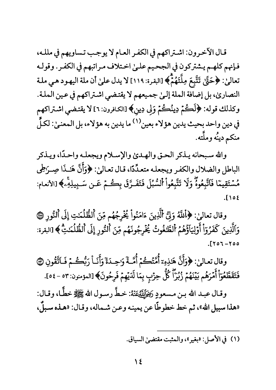 والله سبحانه يذكر الحق والهدى والإسلام ويجعله واحدًا، ويذكر الباطل والضلال والكفر ويجعله متعدِّدًا، قال تعالى: {وَأَنَّ هَذَا صِرَاطِي مُسْتَقِيمًا فَاَتَّبِعُوهُ وَلَا تَتَّبِعُوا اُلسُّبُلَ فَتَفَرَّقَ بِكُمْ عَن سَبِيلِهِ} [الأنعام: ١٥٤].