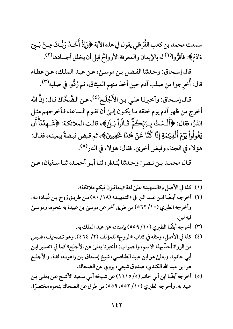 (¬٤) كذا في الأصل، ومثله في كتاب «الروح» للمؤلف (٢/ ٤٦٤). وهو تصحيف، فليس من الرواة أحدٌ بهذا الاسم، والصواب: «أخبرنا يعلى عن الأجلح» كما في «تفسير ابن أبي حاتم». ويعلى هو ابن عبيد الطنافسي، شيخ إسحاق بن راهويه، ثقة. والأجلح هو ابن عبد الله الكندي، صدوق شيعي، يروي عن الضحاك.