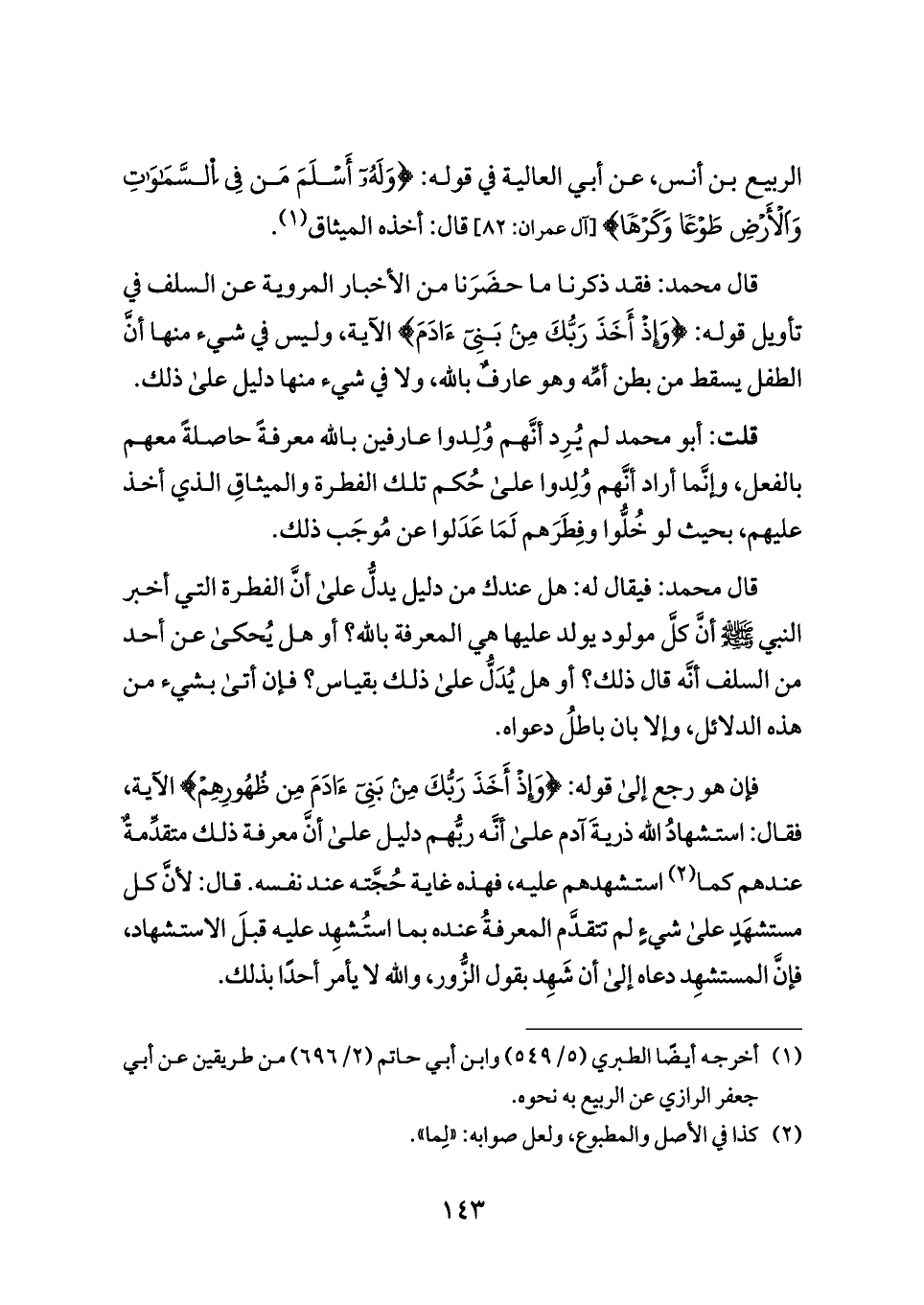 قال محمد: فقد ذكرنا ما حضَرَنا من الأخبار المروية عن السلف في تأويل قوله: {وَإِذْ أَخَذَ رَبُّكَ مِن بَنِي آدَمَ} الآية، وليس في شيء منها أنَّ الطفل يسقط من بطن أمِّه وهو عارفٌ بالله، ولا في شيء منها دليل على ذلك.