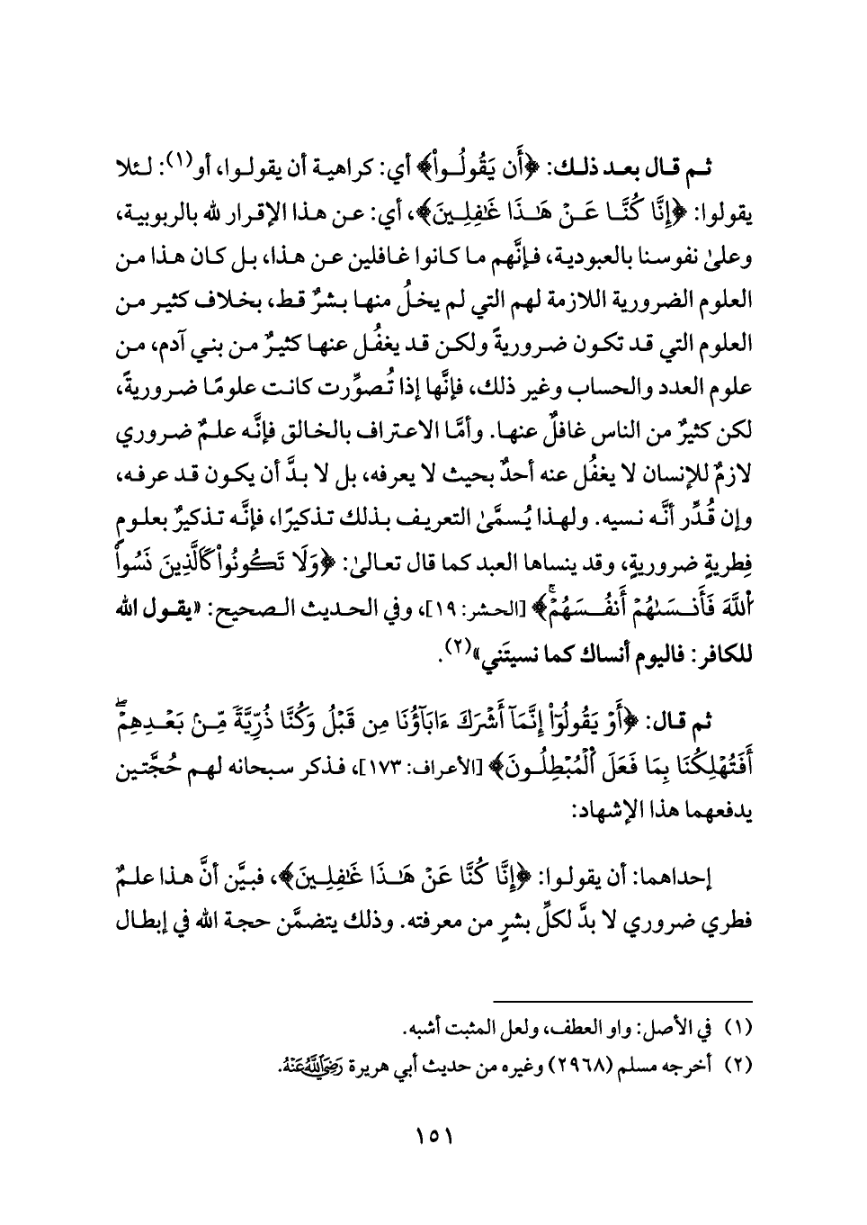 ثم قال بعد ذلك: {أَن يَقُولُوا} أي: كراهية أن يقولوا، أو (¬١): لئلا يقولوا: {إِنَّا كُنَّا عَنْ هَذَا غَافِلِينَ}، أي: عن هذا الإقرار لله بالربوبية، وعلى نفوسنا بالعبودية، فإنَّهم ما كانوا غافلين عن هذا، بل كان هذا من العلوم الضرورية اللازمة لهم التي لم يخلُ منها بشرٌ قط، بخلاف كثير من العلوم التي قد تكون ضروريةً ولكن قد يغفُل عنها كثيرٌ من بني آدم، من علوم العدد والحساب وغير ذلك، فإنَّها إذا تُصوِّرت كانت علومًا ضروريةً، لكن كثيرٌ من الناس غافلٌ عنها. وأمَّا الاعتراف بالخالق فإنَّه علمٌ ضروري لازمٌ للإنسان لا يغفُل عنه أحدٌ بحيث لا يعرفه، بل لا بدَّ أن يكون قد عرفه، وإن قُدِّر أنَّه نسيه. ولهذا يُسمَّى التعريف بذلك تذكيرًا، فإنَّه تذكيرٌ بعلومٍ فِطريةٍ ضروريةٍ، وقد ينساها العبد كما قال تعالى: {وَلَا تَكُونُوا كَاَلَّذِينَ نَسُوا اُللَّهَ فَأَنسَاهُمْ أَنفُسَهُمْ} [الحشر: ١٩]، وفي الحديث الصحيح: «يقول الله للكافر: فاليوم أنساك كما نسيتَني» (¬٢).
