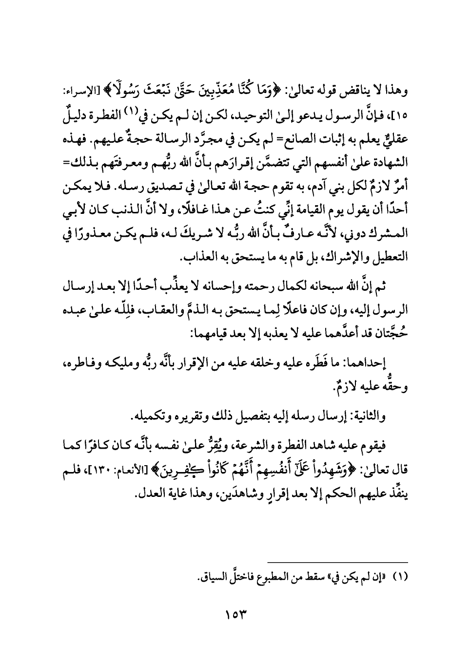 وهذا لا يناقض قوله تعالى: {وَمَا كُنَّا مُعَذِّبِينَ حَتَّى نَبْعَثَ رَسُولًا} [الإسراء: ١٥]، فإنَّ الرسول يدعو إلى التوحيد، لكن إن لم يكن في (¬١) الفطرة دليلٌ عقليٌّ يعلم به إثبات الصانع= لم يكن في مجرَّد الرسالة حجةٌ عليهم. فهذه الشهادة على أنفسهم التي تتضمَّن إقرارَهم بأنَّ الله ربُّهم ومعرفتَهم بذلك= أمرٌ لازمٌ لكل بني آدم، به تقوم حجة الله تعالى في تصديق رسله. فلا يمكن أحدًا أن يقول يوم القيامة إنِّي كنتُ عن هذا غافلًا، ولا أنَّ الذنب كان لأبي المشرك دوني، لأنَّه عارفٌ بأنَّ الله ربُّه لا شريكَ له، فلم يكن معذورًا في التعطيل والإشراك، بل قام به ما يستحق به العذاب.