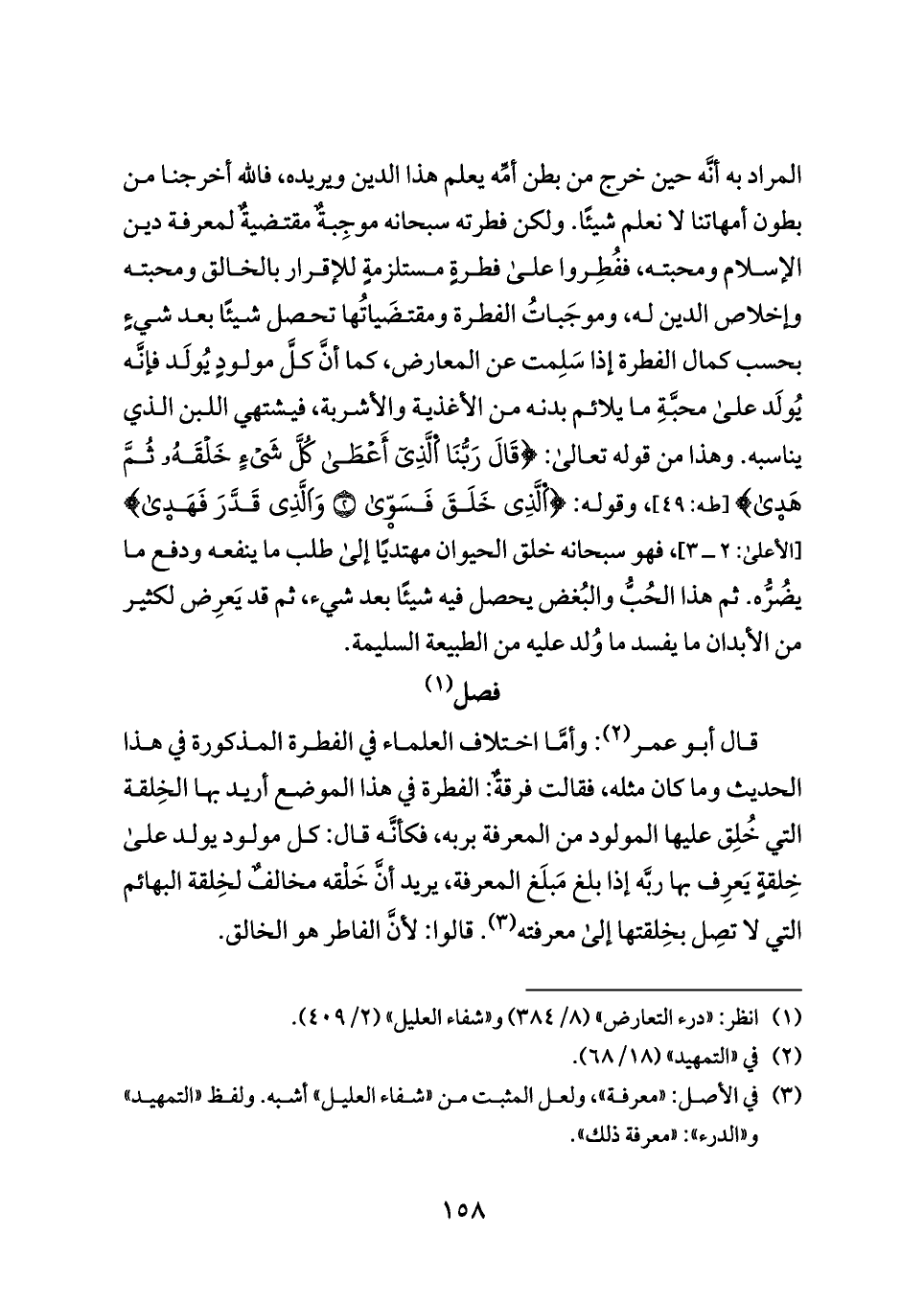 قال أبو عمر (¬٢): وأمَّا اختلاف العلماء في الفطرة المذكورة في هذا الحديث وما كان مثله، فقالت فرقةٌ: الفطرة في هذا الموضع أريد بها الخِلقة التي خُلِق عليها المولود من المعرفة بربه، فكأنَّه قال: كل مولود يولد على خِلقةٍ يَعرِف بها ربَّه إذا بلغ مَبلَغ المعرفة، يريد أنَّ خَلْقه مخالفٌ لخِلقة البهائم التي لا تصِل بخِلقتها إلى معرفته (¬٣). قالوا: لأنَّ الفاطر هو الخالق.