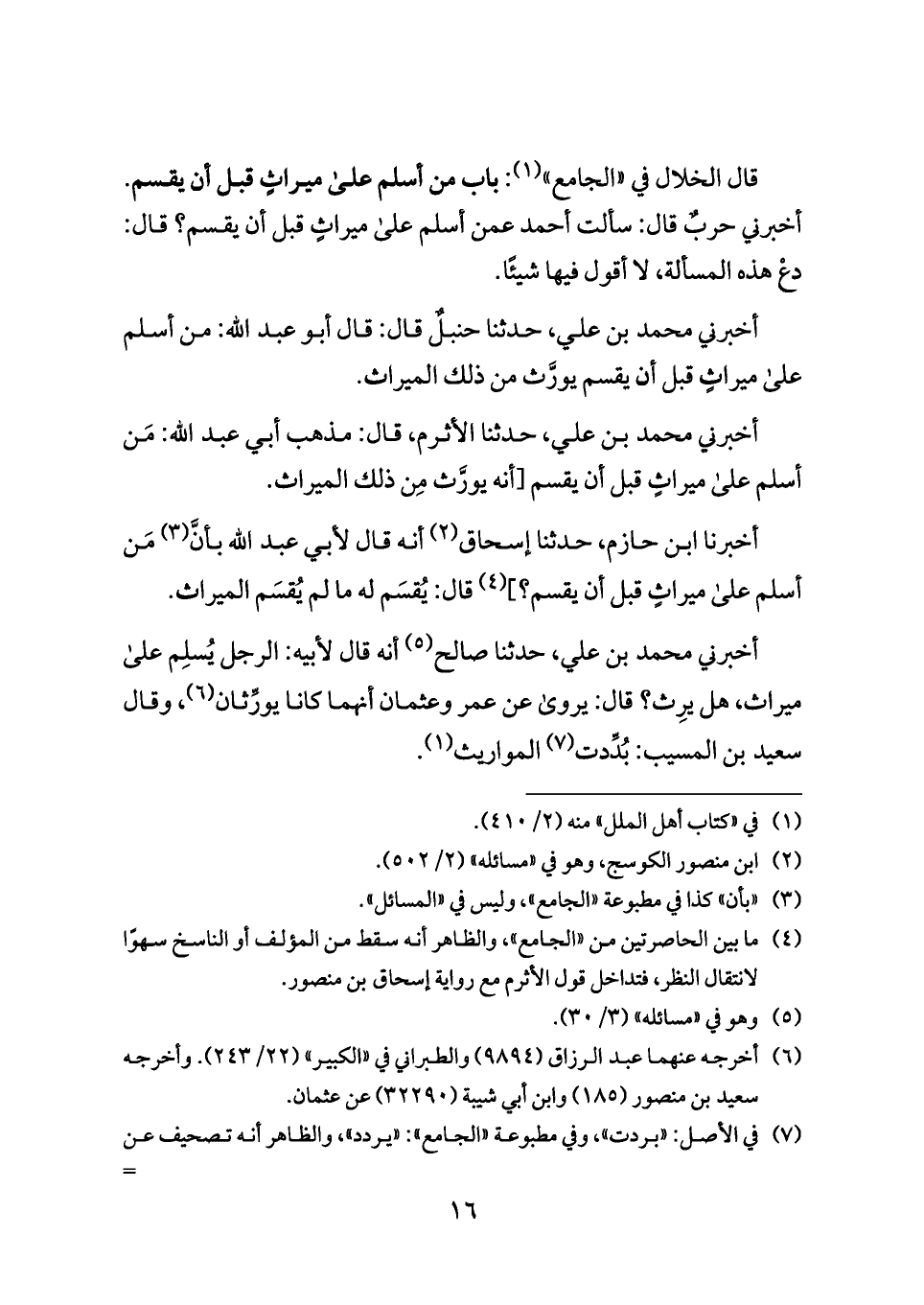 قال الخلال في «الجامع» (¬١): باب من أسلم على ميراثٍ قبل أن يقسم. أخبرني حربٌ قال: سألت أحمد عمن أسلم على ميراثٍ قبل أن يقسم؟ قال: دعْ هذه المسألة، لا أقول فيها شيئًا.