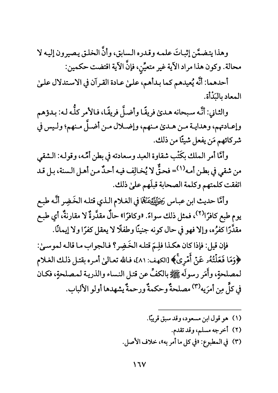 وأمَّا حديث ابن عباس - رضي الله عنهما - في الغلام الذي قتله الخَضِر أنَّه طبع يوم طبع كافرًا (¬٢)، فمثل ذلك سواءً. «وكافرًا» حالٌ مقدَّرةٌ لا مقارنةٌ، أي طبع مقدَّرًا كفرُه، وإلا فهو في حال كونه جنينًا وطفلًا لا يعقل كفرًا ولا إيمانًا.