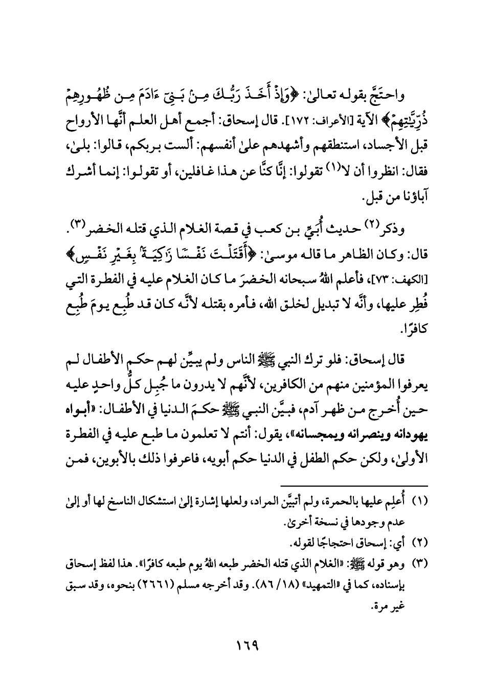 قال إسحاق: فلو ترك النبي - صلى الله عليه وسلم - الناس ولم يبيِّن لهم حكم الأطفال لم يعرفوا المؤمنين منهم من الكافرين، لأنَّهم لا يدرون ما جُبِل كلُّ واحدٍ عليه حين أُخرج من ظهر آدم، فبيَّن النبي - صلى الله عليه وسلم - حكمَ الدنيا في الأطفال: «أبواه يهودانه وينصرانه ويمجسانه»، يقول: أنتم لا تعلمون ما طبع عليه في الفطرة الأولى، ولكن حكم الطفل في الدنيا حكم أبويه، فاعرفوا ذلك بالأبوين، فمن