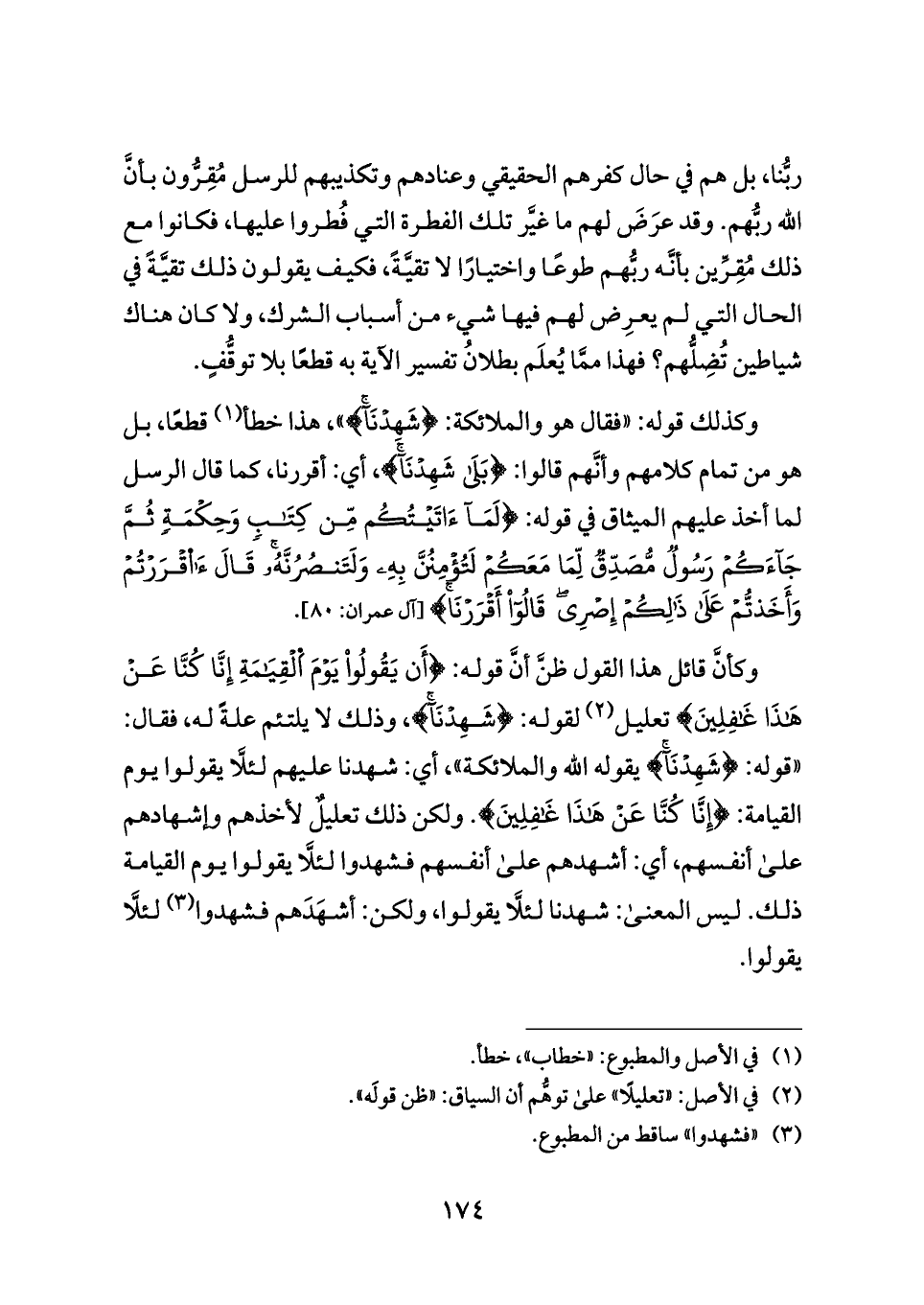 وكأنَّ قائل هذا القول ظنَّ أنَّ قوله: {أَن يَقُولُوا يَوْمَ اَلْقِيَامَةِ إِنَّا كُنَّا عَنْ هَذَا غَافِلِينَ} تعليل (¬٢) لقوله: {شَهِدْنَا}، وذلك لا يلتئم علةً له، فقال: «قوله: {شَهِدْنَا} يقوله الله والملائكة»، أي: شهدنا عليهم لئلَّا يقولوا يوم القيامة: {إِنَّا كُنَّا عَنْ هَذَا غَافِلِينَ}. ولكن ذلك تعليلٌ لأخذهم وإشهادهم على أنفسهم، أي: أشهدهم على أنفسهم فشهدوا لئلَّا يقولوا يوم القيامة ذلك. ليس المعنى: شهدنا لئلَّا يقولوا، ولكن: أشهَدَهم فشهدوا (¬٣) لئلَّا يقولوا.