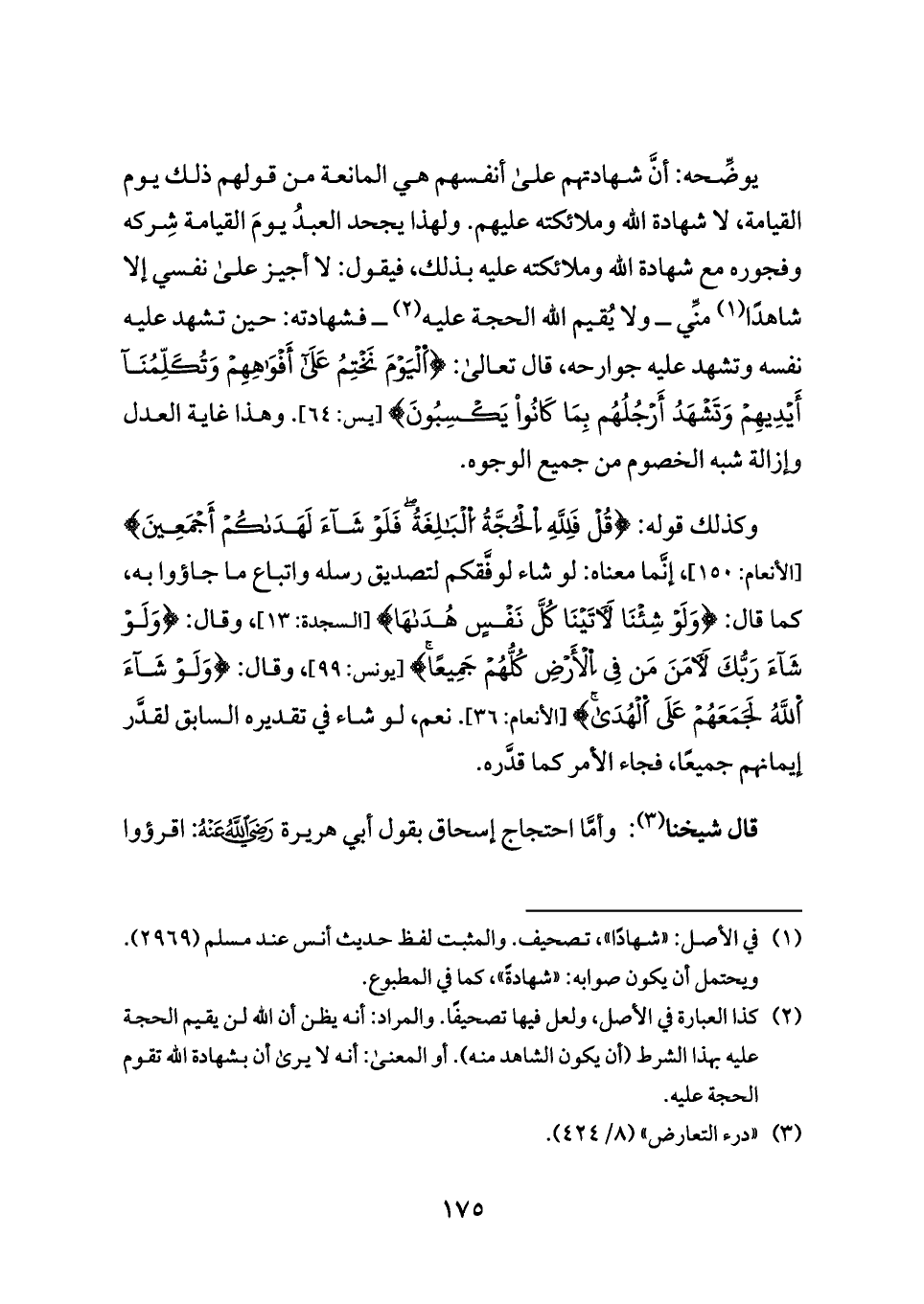 يوضِّحه: أنَّ شهادتهم على أنفسهم هي المانعة من قولهم ذلك يوم القيامة، لا شهادة الله وملائكته عليهم. ولهذا يجحد العبدُ يومَ القيامة شِركه وفجوره مع شهادة الله وملائكته عليه بذلك، فيقول: لا أجيز على نفسي إلا شاهدًا (¬١) منِّي ــ ولا يُقيم الله الحجة عليه (¬٢) ــ فشهادته: حين تشهد عليه نفسه وتشهد عليه جوارحه، قال تعالى: {اَلْيَوْمَ نَخْتِمُ عَلَى أَفْوَاهِهِمْ وَتُكَلِّمُنَا أَيْدِيهِمْ وَتَشْهَدُ أَرْجُلُهُم بِمَا كَانُوا يَكْسِبُونَ} [يس: ٦٤]. وهذا غاية العدل وإزالة شبه الخصوم من جميع الوجوه.