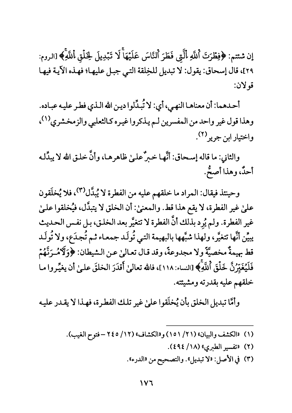 وحينئذ فيقال: المراد ما خلقهم عليه من الفطرة لا يُبدَّل (¬٣)، فلا يُخلَقون على غير الفطرة، لا يقع هذا قط. والمعنى: أن الخلق لا يتبدَّل، فيُخلقوا على غير الفطرة. ولم يُرِد بذلك أنَّ الفطرة لا تتغيَّر بعد الخلق، بل نفس الحديث يبيِّن أنَّها تتغيَّر، ولهذا شبَّهها بالبهيمة التي تُولَد جمعاء ثم تُجدَع، ولا تُولَد قط بهيمةٌ مخصيَّةً ولا مجدوعةً، وقد قال تعالى عن الشيطان: {وَلَأمُرَنَّهُمْ فَلَيُغَيِّرُنَّ خَلْقَ اَللَّهِ} [النساء: ١١٨]، فالله تعالى أَقدَرَ الخلقَ على أن يغيِّروا ما خلقهم عليه بقدرته ومشيئته.