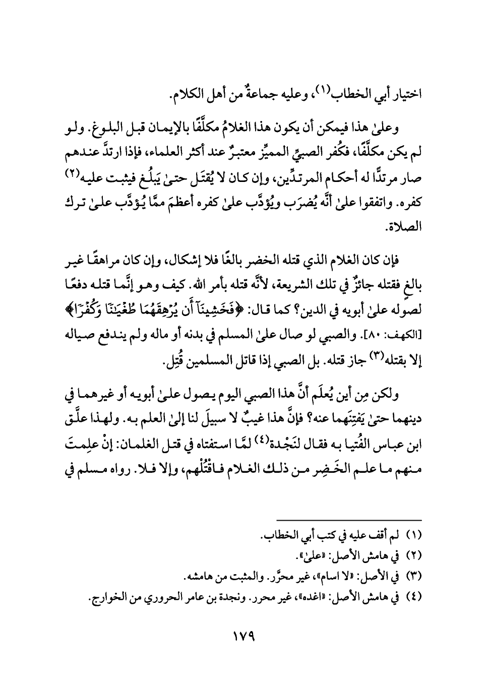 ولكن مِن أين يُعلَم أنَّ هذا الصبي اليوم يصول على أبويه أو غيرهما في دينهما حتى يَفتِنَهما عنه؟ فإنَّ هذا غيبٌ لا سبيلَ لنا إلى العلم به. ولهذا علَّق ابن عباس الفُتيا به فقال لنَجْدة (¬٤) لمَّا استفتاه في قتل الغلمان: إنْ علِمتَ منهم ما علم الخَضِر من ذلك الغلام فاقْتُلْهم، وإلا فلا. رواه مسلم في