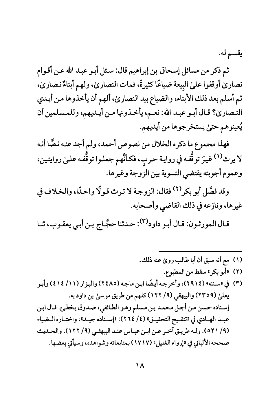 ثم ذكر من مسائل إسحاق بن إبراهيم قال: سئل أبو عبد الله عن أقوام نصارى أوقفوا على البِيعة ضياعًا كثيرةً، فمات النصارى، ولهم أبناءٌ نصارى، ثم أسلم بعد ذلك الأبناء، والضياع بيد النصارى، ألهم أن يأخذوها من أيدي النصارى؟ قال أبو عبد الله: نعم، يأخذونها من أيديهم، وللمسلمين أن يُعينوهم حتى يستخرجوها من أيديهم.