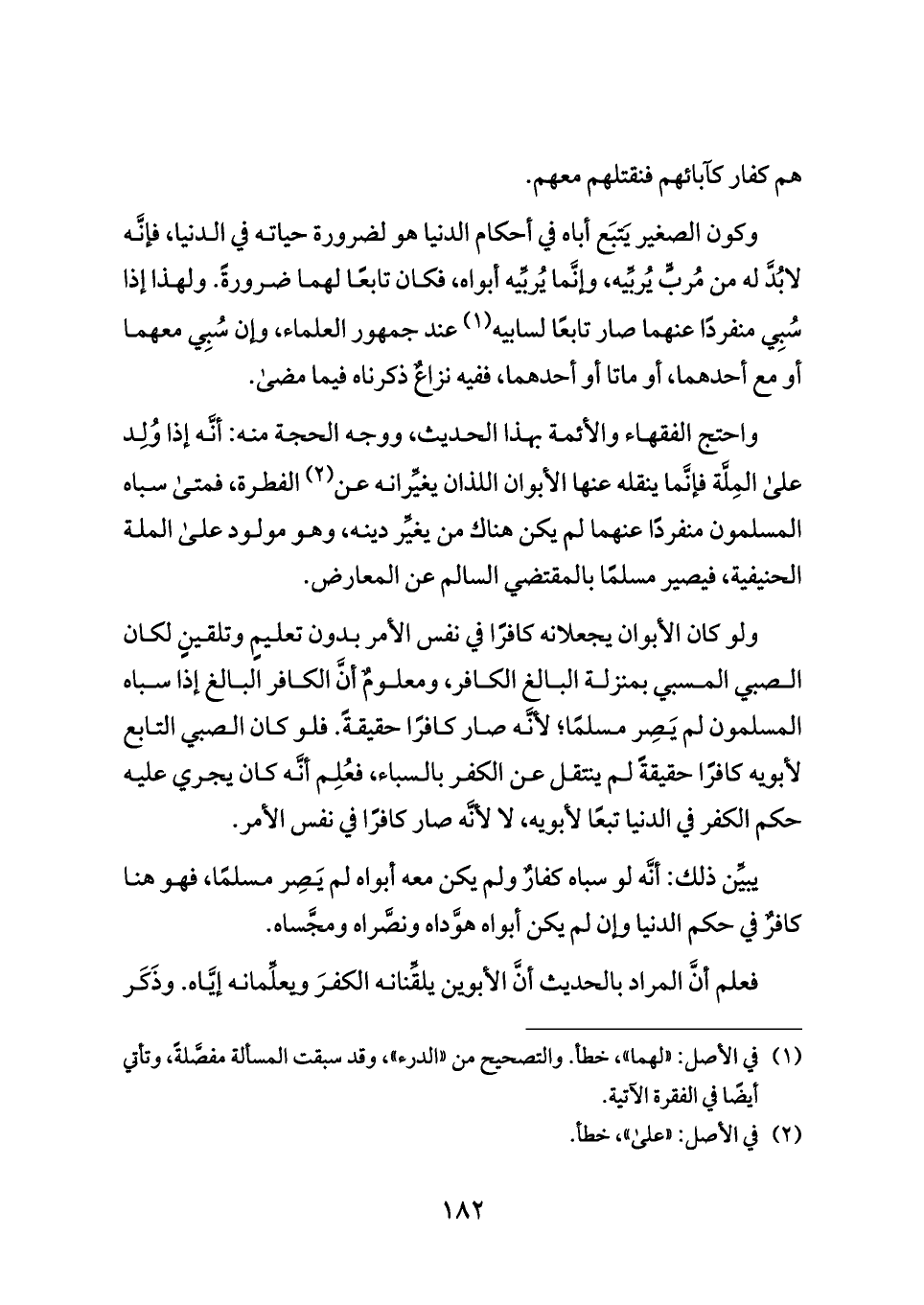 ولو كان الأبوان يجعلانه كافرًا في نفس الأمر بدون تعليمٍ وتلقينٍ لكان الصبي المسبي بمنزلة البالغ الكافر، ومعلومٌ أنَّ الكافر البالغ إذا سباه المسلمون لم يَصِر مسلمًا؛ لأنَّه صار كافرًا حقيقةً. فلو كان الصبي التابع لأبويه كافرًا حقيقةً لم ينتقل عن الكفر بالسباء، فعُلِم أنَّه كان يجري عليه حكم الكفر في الدنيا تبعًا لأبويه، لا لأنَّه صار كافرًا في نفس الأمر.