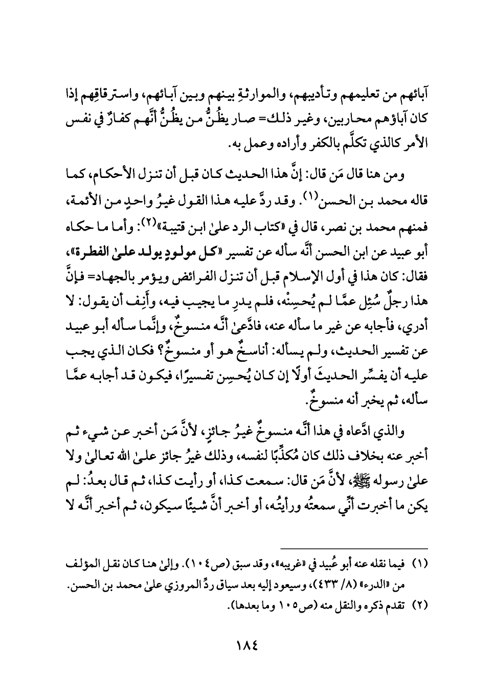 ومن هنا قال مَن قال: إنَّ هذا الحديث كان قبل أن تنزل الأحكام، كما قاله محمد بن الحسن (¬١). وقد ردَّ عليه هذا القول غيرُ واحدٍ من الأئمة، فمنهم محمد بن نصر، قال في «كتاب الرد على ابن قتيبة» (¬٢): وأما ما حكاه أبو عبيد عن ابن الحسن أنَّه سأله عن تفسير «كل مولودٍ يولد على الفطرة»، فقال: كان هذا في أول الإسلام قبل أن تنزل الفرائض ويؤمر بالجهاد= فإنَّ هذا رجلٌ سُئِل عمَّا لم يُحسِنْه، فلم يدرِ ما يجيب فيه، وأَنِف أن يقول: لا أدري، فأجابه عن غير ما سأله عنه، فادَّعى أنَّه منسوخٌ، وإنَّما سأله أبو عبيد عن تفسير الحديث، ولم يسأله: أناسخٌ هو أو منسوخٌ؟ فكان الذي يجب عليه أن يفسِّر الحديثَ أولًا إن كان يُحسِن تفسيرًا، فيكون قد أجابه عمَّا سأله، ثم يخبر أنه منسوخٌ.
