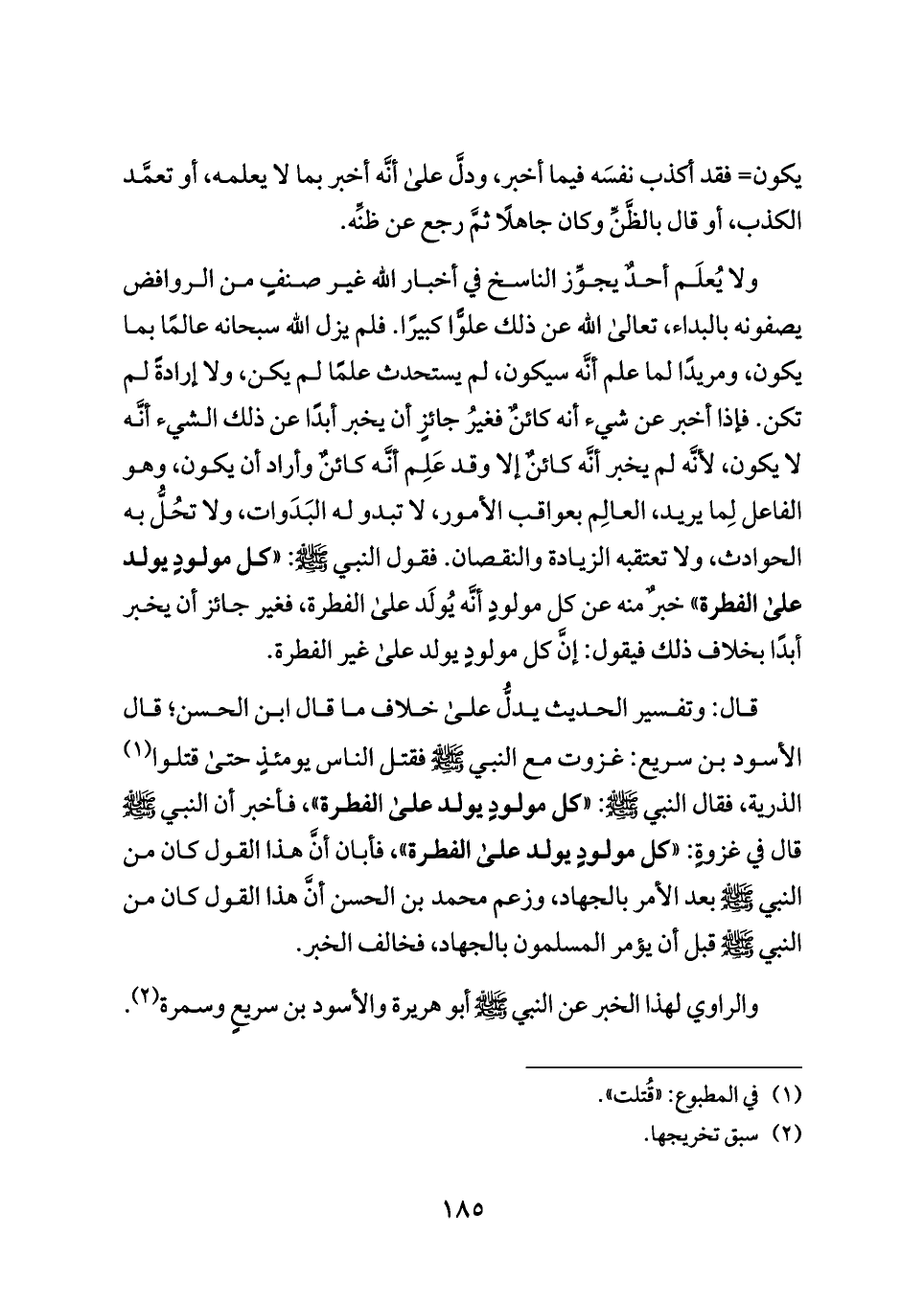 ولا يُعلَم أحدٌ يجوِّز الناسخ في أخبار الله غير صنفٍ من الروافض يصفونه بالبداء، تعالى الله عن ذلك علوًّا كبيرًا. فلم يزل الله سبحانه عالمًا بما يكون، ومريدًا لما علم أنَّه سيكون، لم يستحدث علمًا لم يكن، ولا إرادةً لم تكن. فإذا أخبر عن شيء أنه كائنٌ فغيرُ جائزٍ أن يخبر أبدًا عن ذلك الشيء أنَّه لا يكون، لأنَّه لم يخبر أنَّه كائنٌ إلا وقد عَلِم أنَّه كائنٌ وأراد أن يكون، وهو الفاعل لِما يريد، العالِم بعواقب الأمور، لا تبدو له البَدَوات، ولا تحُلُّ به الحوادث، ولا تعتقبه الزيادة والنقصان. فقول النبي - صلى الله عليه وسلم -: «كل مولودٍ يولد على الفطرة» خبرٌ منه عن كل مولودٍ أنَّه يُولَد على الفطرة، فغير جائز أن يخبر أبدًا بخلاف ذلك فيقول: إنَّ كل مولودٍ يولد على غير الفطرة.
