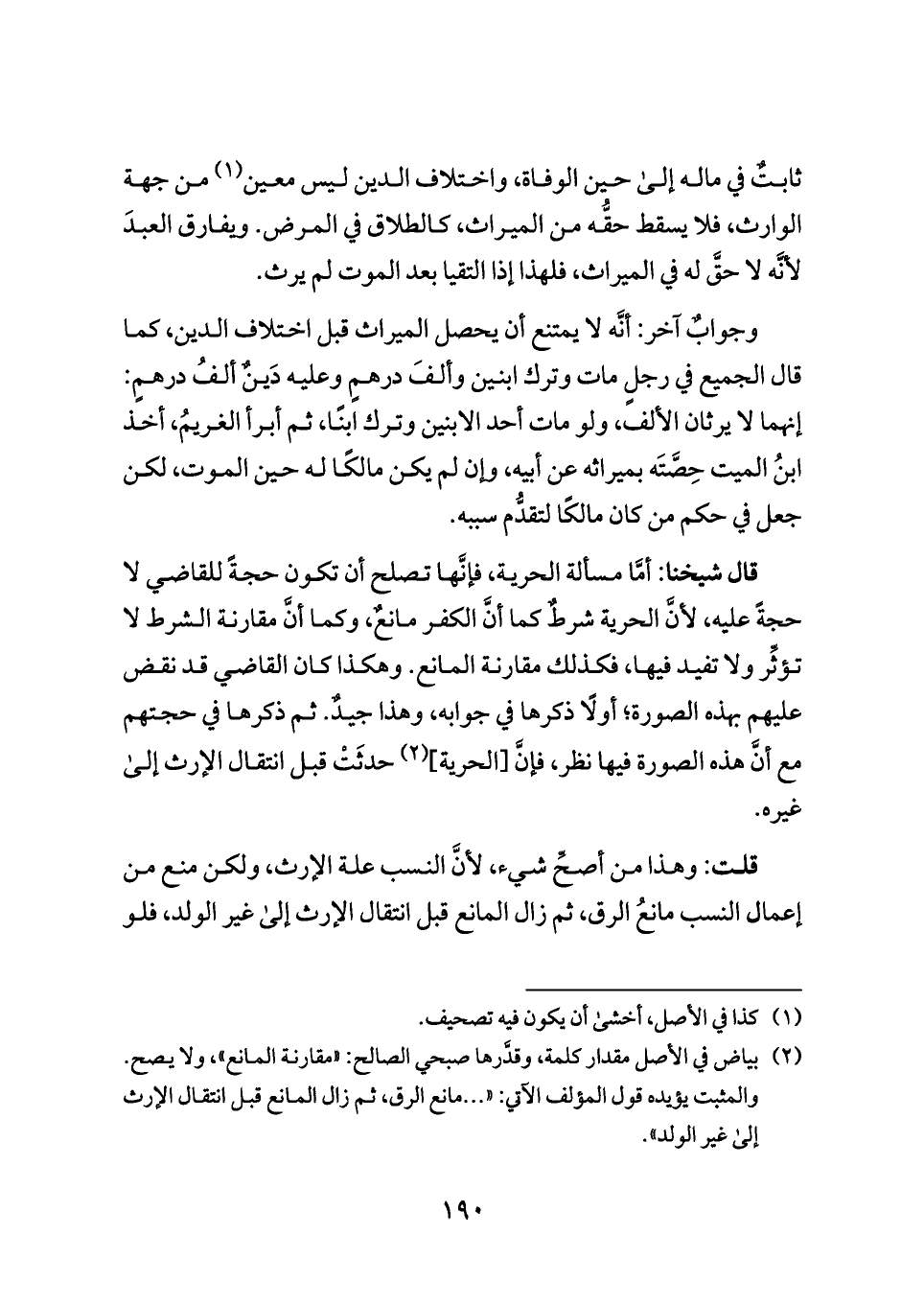 قال شيخنا: أمَّا مسألة الحرية، فإنَّها تصلح أن تكون حجةً للقاضي لا حجةً عليه، لأنَّ الحرية شرطٌ كما أنَّ الكفر مانعٌ، وكما أنَّ مقارنة الشرط لا تؤثِّر ولا تفيد فيها، فكذلك مقارنة المانع. وهكذا كان القاضي قد نقض عليهم بهذه الصورة؛ أولًا ذكرها في جوابه، وهذا جيدٌ. ثم ذكرها في حجتهم مع أنَّ هذه الصورة فيها نظر، فإنَّ [الحرية] (¬٢) حدثَتْ قبل انتقال الإرث إلى غيره.