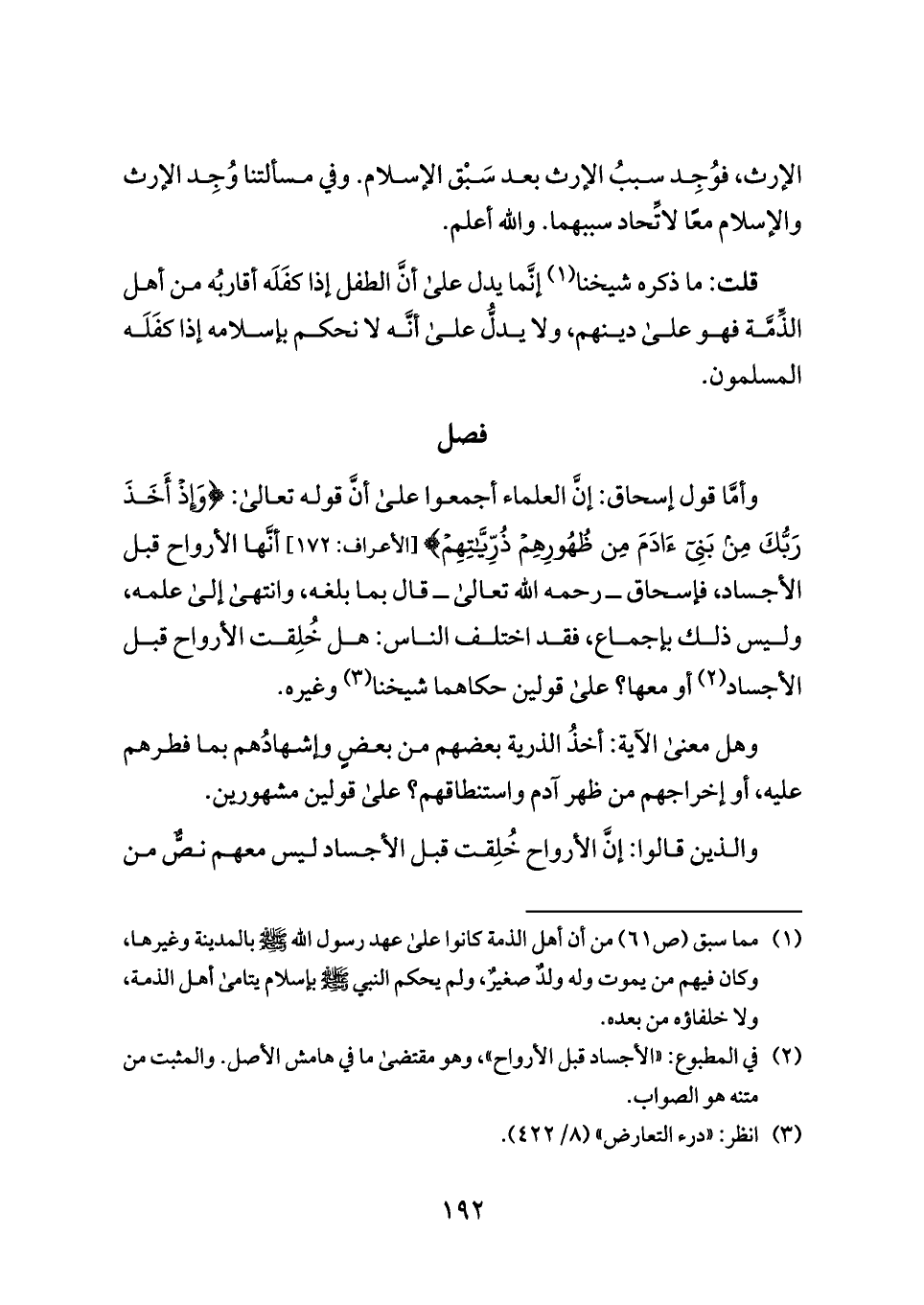 وأمَّا قول إسحاق: إنَّ العلماء أجمعوا على أنَّ قوله تعالى: {وَإِذْ أَخَذَ رَبُّكَ مِن بَنِي آدَمَ مِن ظُهُورِهِمْ ذُرِّيَّاتِهِمْ} [الأعراف: ١٧٢] أنَّها الأرواح قبل الأجساد، فإسحاق ــ رحمه الله تعالى ــ قال بما بلغه، وانتهى إلى علمه، وليس ذلك بإجماع، فقد اختلف الناس: هل خُلِقت الأرواح قبل الأجساد (¬٢) أو معها؟ على قولين حكاهما شيخنا (¬٣) وغيره.