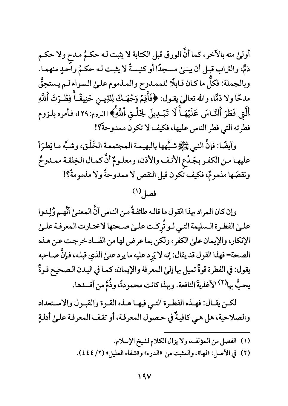 أولى منه بالآخر، كما أنَّ الورق قبل الكتابة لا يثبت له حكمُ مدحٍ ولا حكم ذمٍّ، والتراب قبل أن يبنى مسجدًا أو كنيسةً لا يثبت له حكمُ واحدٍ منهما. وبالجملة: فكلُّ ما كان قابلًا للممدوح والمذموم على السواء لم يستحِقَّ مدحًا ولا ذمًّا، والله تعالى يقول: {فَأَقِمْ وَجْهَكَ لِلدِّينِ حَنِيفًا فِطْرَتَ اَللَّهِ اِلَّتِي فَطَرَ اَلنَّاسَ عَلَيْهَا لَا تَبْدِيلَ لِخَلْقِ اِللَّهِ} [الروم: ٢٩]، فأمره بلزوم فطرته التي فطر الناس عليها، فكيف لا تكون ممدوحةً؟!