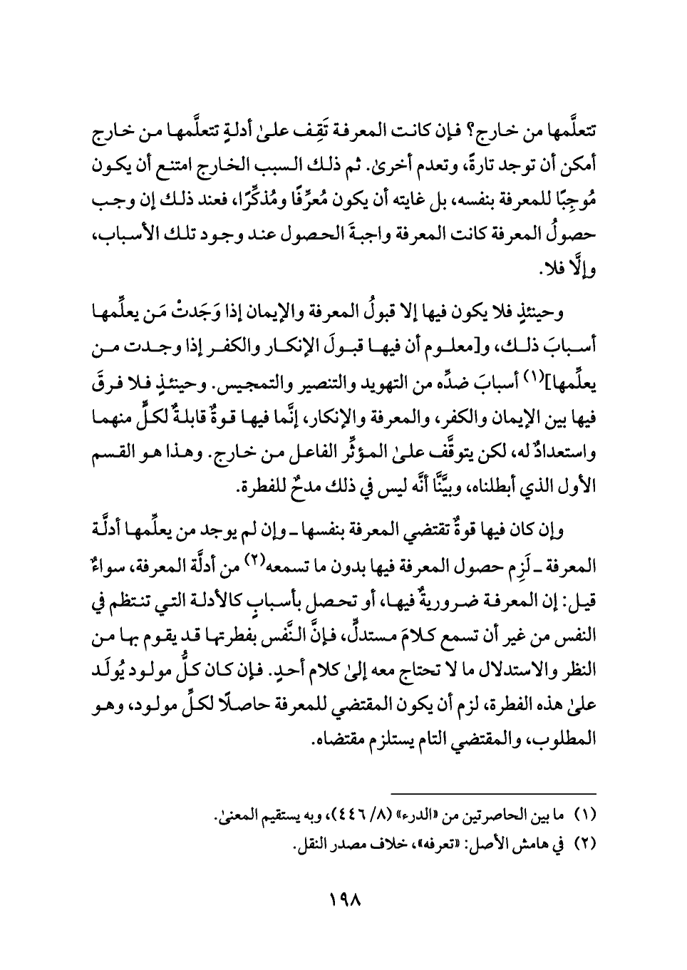 تتعلَّمها من خارج؟ فإن كانت المعرفة تَقِف على أدلةٍ تتعلَّمها من خارج أمكن أن توجد تارةً، وتعدم أخرى. ثم ذلك السبب الخارج امتنع أن يكون مُوجِبًا للمعرفة بنفسه، بل غايته أن يكون مُعرِّفًا ومُذكِّرًا، فعند ذلك إن وجب حصولُ المعرفة كانت المعرفة واجبةَ الحصول عند وجود تلك الأسباب، وإلَّا فلا.