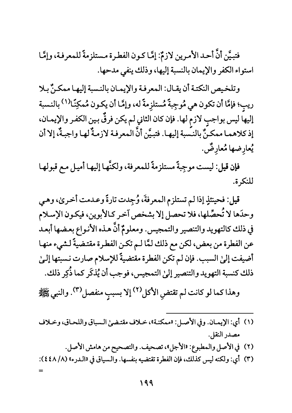 فتبيَّن أنَّ أحد الأمرين لازمٌ: إمَّا كون الفطرة مستلزمةً للمعرفة، وإمَّا استواء الكفر والإيمان بالنسبة إليها، وذلك ينفي مدحها.