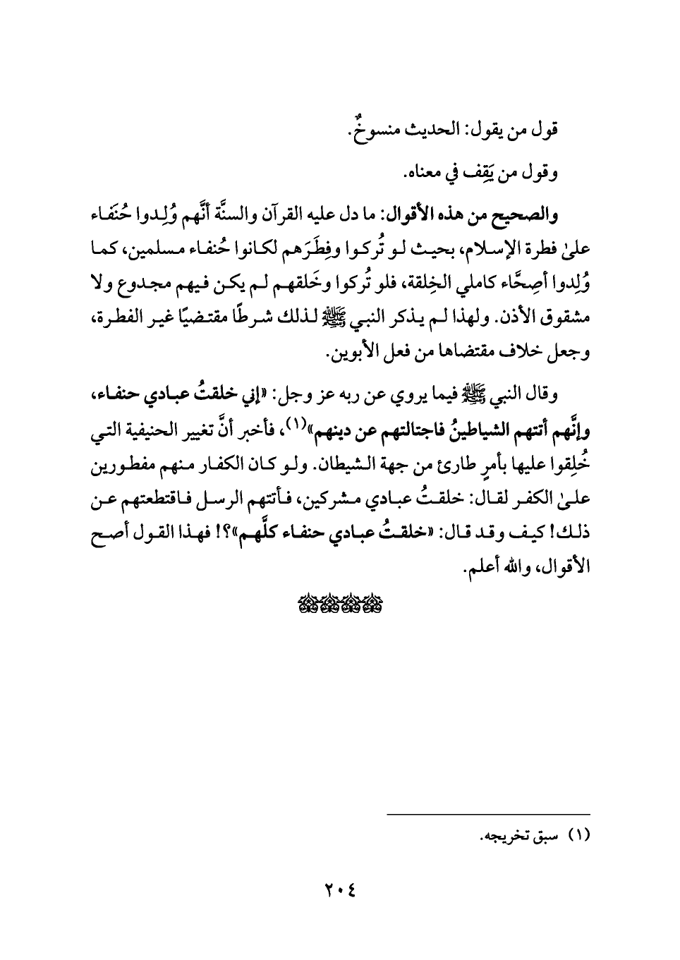والصحيح من هذه الأقوال: ما دل عليه القرآن والسنَّة أنَّهم وُلِدوا حُنَفاء على فطرة الإسلام، بحيث لو تُركوا وفِطَرَهم لكانوا حُنفاء مسلمين، كما وُلِدوا أصِحَّاء كاملي الخِلقة، فلو تُركوا وخَلقهم لم يكن فيهم مجدوع ولا مشقوق الأذن. ولهذا لم يذكر النبي - صلى الله عليه وسلم - لذلك شرطًا مقتضيًا غير الفطرة، وجعل خلاف مقتضاها من فعل الأبوين.