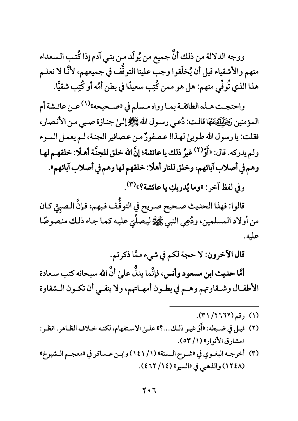 واحتجت هذه الطائفة بما رواه مسلم في «صحيحه» (¬١) عن عائشة أم المؤمنين - رضي الله عنها - قالت: دُعي رسول الله - صلى الله عليه وسلم - إلى جنازة صبي من الأنصار، فقلت: يا رسول الله طوبى لهذا! عصفورٌ من عصافير الجنة، لم يعمل السوء ولم يدركه. قال: «أَوْ (¬٢) غيرُ ذلك يا عائشة؛ إنَّ الله خلق للجنَّة أهلًا: خلقهم لها وهم في أصلاب آبائهم، وخلق للنار أهلًا: خلقهم لها وهم في أصلاب آبائهم».