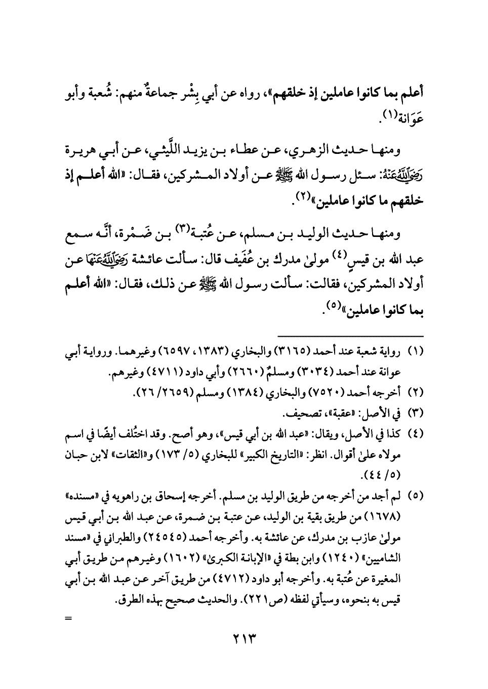 ومنها حديث الوليد بن مسلم، عن عُتبة (¬٣) بن ضَمْرة، أنَّه سمع عبد الله بن قيسٍ (¬٤) مولى مدرك بن عُفَيف قال: سألت عائشة - رضي الله عنها - عن أولاد المشركين، فقالت: سألت رسول الله - صلى الله عليه وسلم - عن ذلك، فقال: «الله أعلم بما كانوا عاملين» (¬٥).