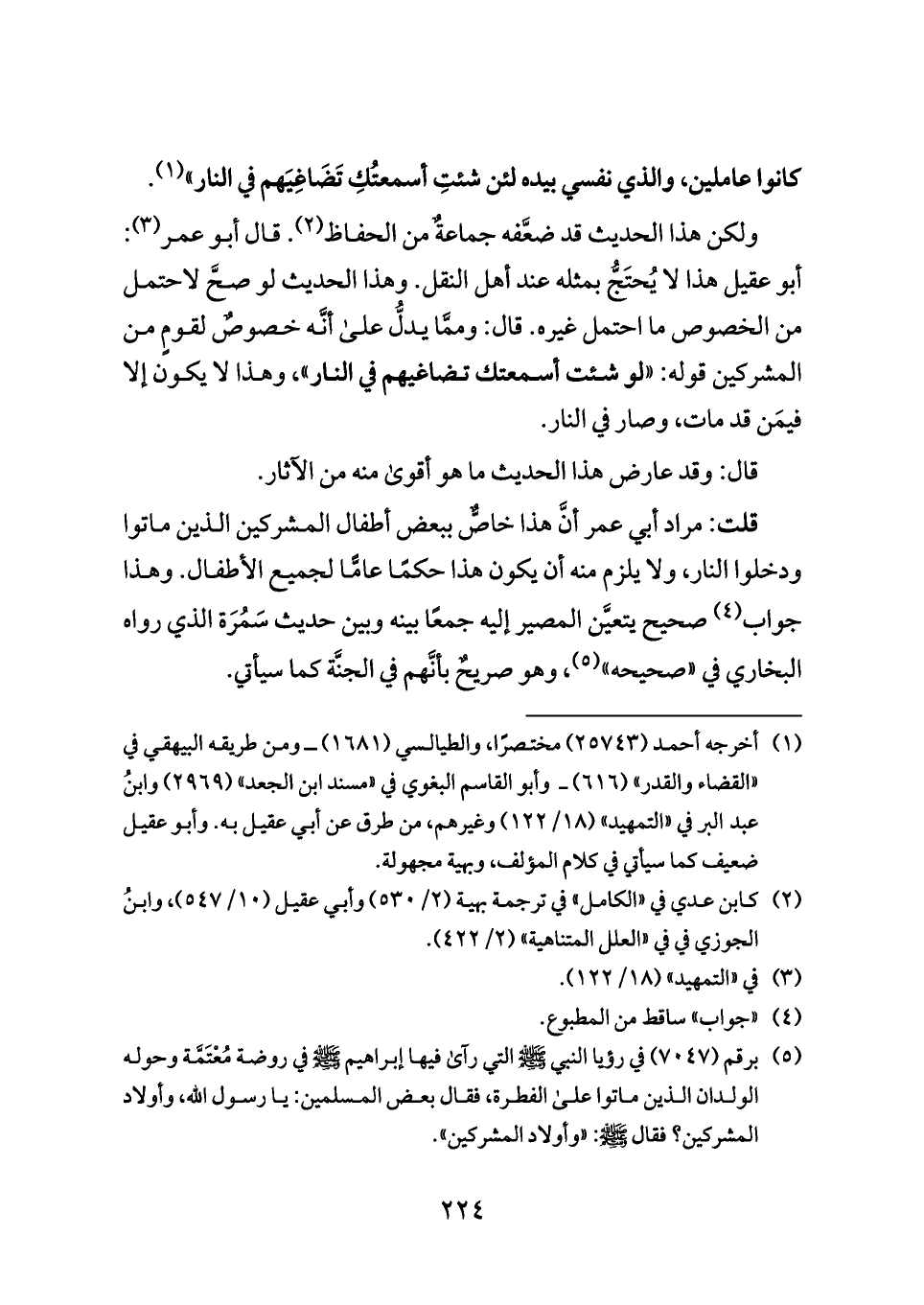 قلت: مراد أبي عمر أنَّ هذا خاصٌّ ببعض أطفال المشركين الذين ماتوا ودخلوا النار، ولا يلزم منه أن يكون هذا حكمًا عامًّا لجميع الأطفال. وهذا جواب (¬٤) صحيح يتعيَّن المصير إليه جمعًا بينه وبين حديث سَمُرَة الذي رواه البخاري في «صحيحه» (¬٥)، وهو صريحٌ بأنَّهم في الجنَّة كما سيأتي.