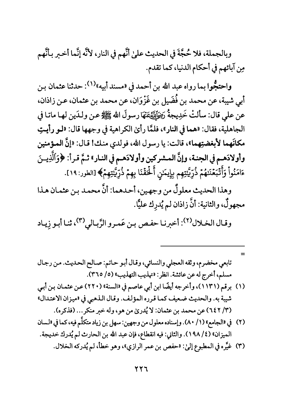 واحتجُّوا بما رواه عبد الله بن أحمد في «مسند أبيه» (¬١): حدثنا عثمان بن أبي شيبة، عن محمد بن فُضَيل بن غَزْوَان، عن محمد بن عثمان، عن زاذان، عن علي قال: سألتْ خَدِيجةُ - رضي الله عنها - رسولَ الله - صلى الله عليه وسلم - عن ولدَين لها ماتا في الجاهلية، فقال: «هما في النار»، فلمَّا رأى الكراهية في وجهها قال: «لو رأيتِ مكانَهما لأبغضتِهما»، قالت: يا رسول الله، فولدي منك! قال: «إنَّ المؤمنين وأولادَهم في الجنة، وإنَّ المشركين وأولادَهم في النار» ثمَّ قرأ: {وَاَلَّذِينَ آمَنُوا وَأَتْبَعْنَاهُمْ ذُرِّيَّاتِهِم بِإِيمَانٍ أَلْحَقْنَا بِهِمْ ذُرِّيَّاتِهِمْ} [الطور: ١٩].