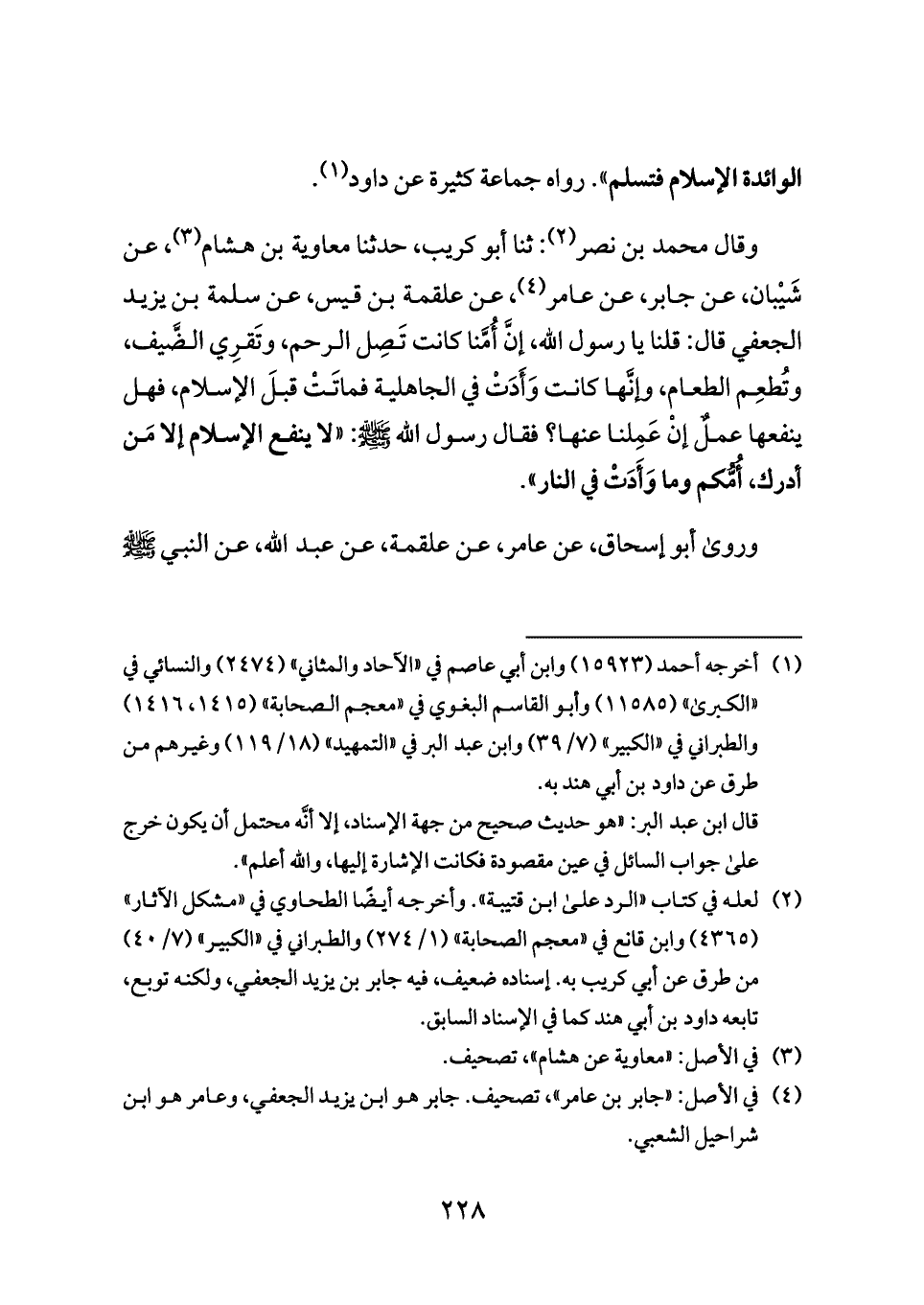 وقال محمد بن نصر (¬٢): ثنا أبو كريب، حدثنا معاوية بن هشام (¬٣)، عن شَيْبان، عن جابر، عن عامر (¬٤)، عن علقمة بن قيس، عن سلمة بن يزيد الجعفي قال: قلنا يا رسول الله، إنَّ أُمَّنا كانت تَصِل الرحم، وتَقرِي الضَّيف، وتُطعِم الطعام، وإنَّها كانت وَأَدَتْ في الجاهلية فماتَتْ قبلَ الإسلام، فهل ينفعها عملٌ إنْ عَمِلنا عنها؟ فقال رسول الله - صلى الله عليه وسلم -: «لا ينفع الإسلام إلا مَن أدرك، أُمُّكم وما وَأَدَتْ في النار».