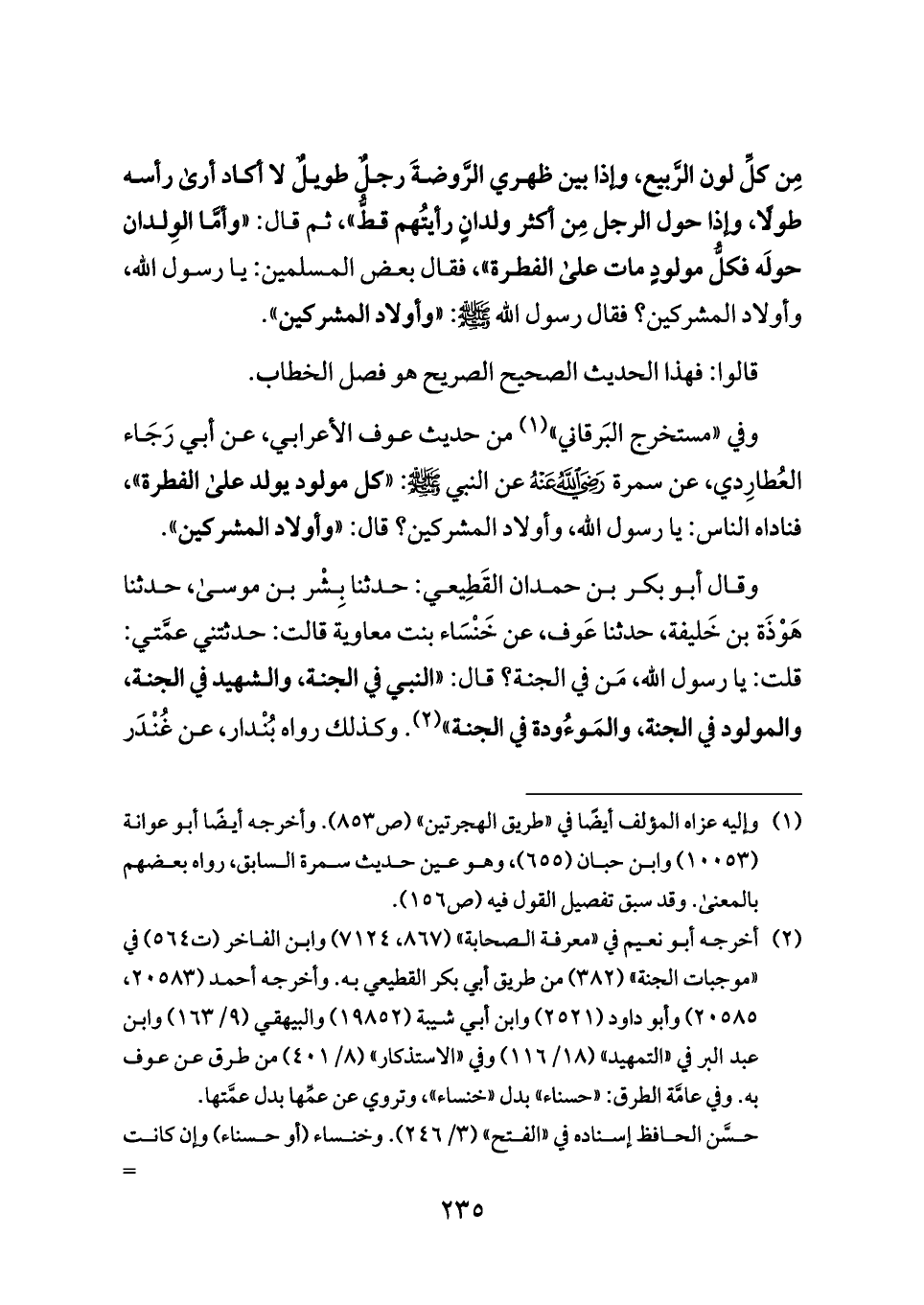 وفي «مستخرج البَرقاني» (¬١) من حديث عوف الأعرابي، عن أبي رَجَاء العُطارِدي، عن سمرة - رضي الله عنه - عن النبي - صلى الله عليه وسلم -: «كل مولود يولد على الفطرة»، فناداه الناس: يا رسول الله، وأولاد المشركين؟ قال: «وأولاد المشركين».