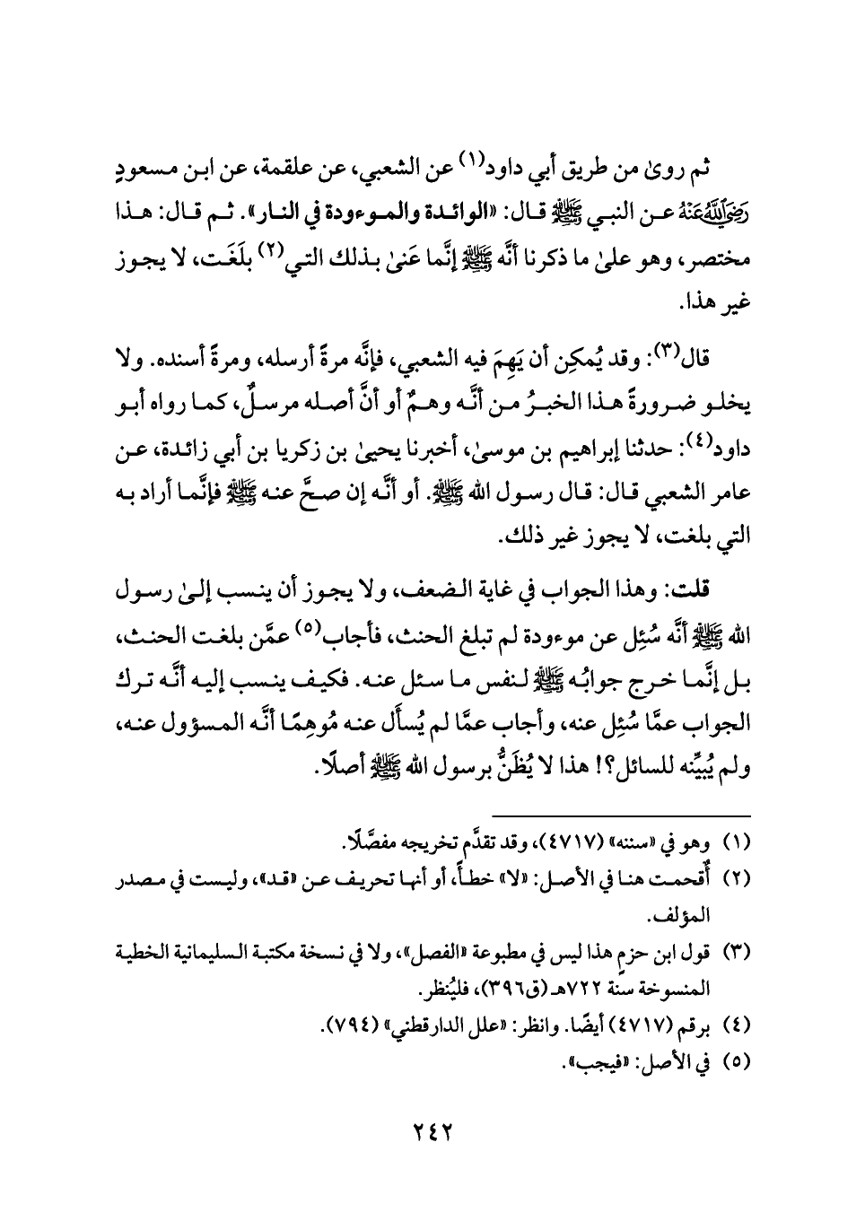 قلت: وهذا الجواب في غاية الضعف، ولا يجوز أن ينسب إلى رسول الله - صلى الله عليه وسلم - أنَّه سُئِل عن موءودة لم تبلغ الحنث، فأجاب (¬٥) عمَّن بلغت الحنث، بل إنَّما خرج جوابُه - صلى الله عليه وسلم - لنفس ما سئل عنه. فكيف ينسب إليه أنَّه ترك الجواب عمَّا سُئِل عنه، وأجاب عمَّا لم يُسأَل عنه مُوهِمًا أنَّه المسؤول عنه، ولم يُبيِّنه للسائل؟! هذا لا يُظَنُّ برسول الله - صلى الله عليه وسلم - أصلًا.