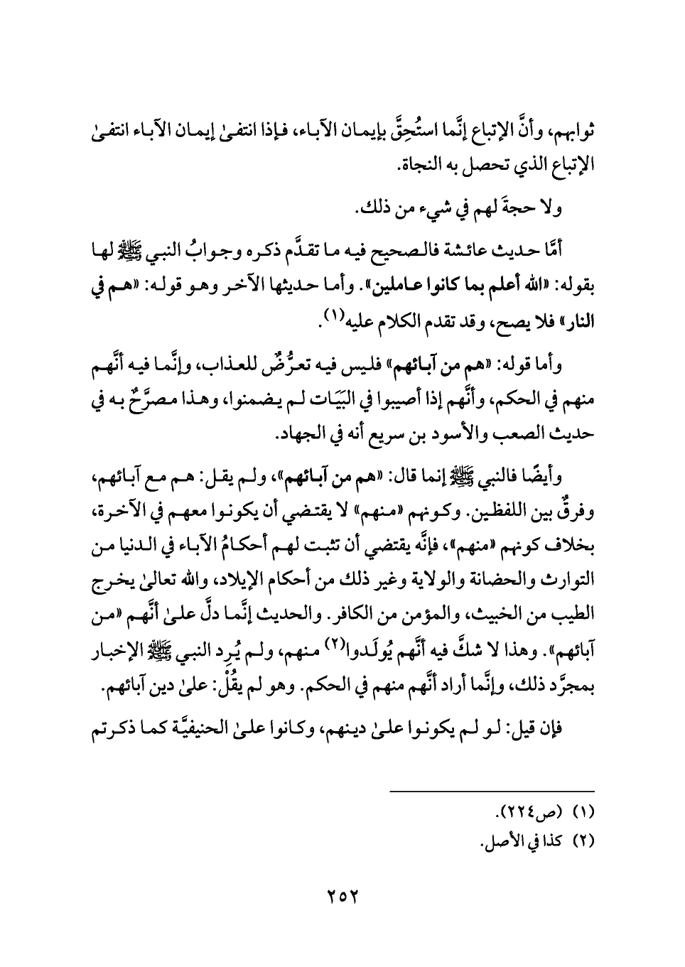 وأيضًا فالنبي - صلى الله عليه وسلم - إنما قال: «هم من آبائهم»، ولم يقل: هم مع آبائهم، وفرقٌ بين اللفظين. وكونهم «منهم» لا يقتضي أن يكونوا معهم في الآخرة، بخلاف كونهم «منهم»، فإنَّه يقتضي أن تثبت لهم أحكامُ الآباء في الدنيا من التوارث والحضانة والولاية وغير ذلك من أحكام الإيلاد، والله تعالى يخرج الطيب من الخبيث، والمؤمن من الكافر. والحديث إنَّما دلَّ على أنَّهم «من آبائهم». وهذا لا شكَّ فيه أنَّهم يُولَدوا (¬٢) منهم، ولم يُرِد النبي - صلى الله عليه وسلم - الإخبار بمجرَّد ذلك، وإنَّما أراد أنَّهم منهم في الحكم. وهو لم يقُلْ: على دين آبائهم.
