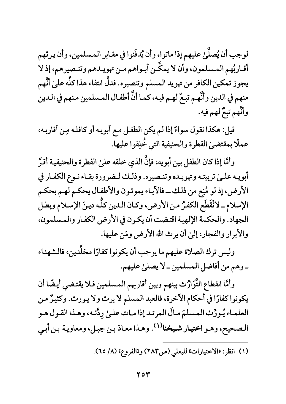 لوجب أن يُصلَّى عليهم إذا ماتوا، وأن يُدفَنوا في مقابر المسلمين، وأن يرثهم أقاربُهم المسلمون، وأن لا يمكَّن أبواهم من تهويدهم وتنصيرهم، إذ لا يجوز تمكين الكافر من تهويد المسلم وتنصيره. فدلَّ انتفاء هذا كلِّه على أنَّهم منهم في الدين وأنَّهم تبعٌ لهم فيه، كما أنَّ أطفال المسلمين منهم في الدين وأنَّهم تبعٌ لهم فيه.