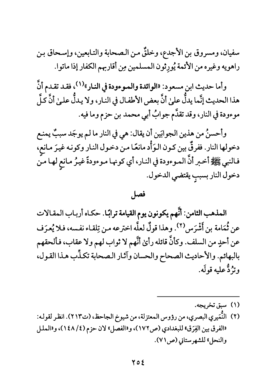 المذهب الثامن: أنَّهم يكونون يوم القيامة ترابًا. حكاه أرباب المقالات عن ثُمَامة بن أَشْرَس (¬٢). وهذا قولٌ لعلَّه اخترعه من تِلقاء نفسه، فلا يُعرَف عن أحدٍ من السلف. وكأنَّ قائله رأى أنَّهم لا ثواب لهم ولا عقاب، فألحقهم بالبهائم. والأحاديث الصحاح والحسان وآثار الصحابة تكذِّب هذا القول، وترُدُّ عليه قولَه.