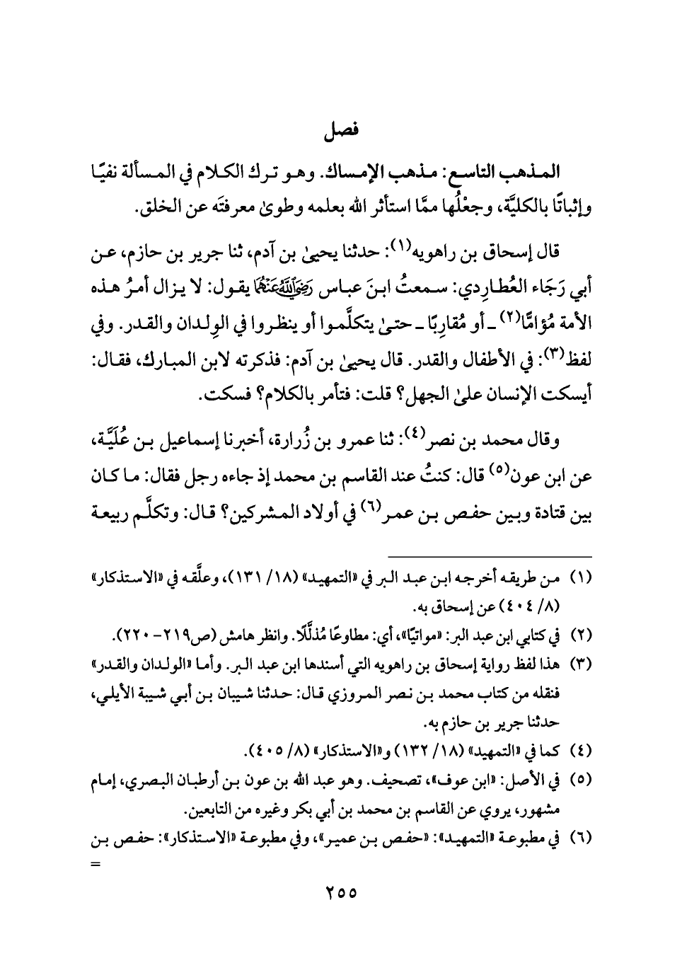 قال إسحاق بن راهويه (¬١): حدثنا يحيى بن آدم، ثنا جرير بن حازم، عن أبي رَجَاء العُطارِدي: سمعتُ ابنَ عباس - رضي الله عنهما - يقول: لا يزال أمرُ هذه الأمة مُؤامًّا (¬٢) ــ أو مُقارِبًا ــ حتى يتكلَّموا أو ينظروا في الوِلدان والقدر. وفي لفظ (¬٣): في الأطفال والقدر. قال يحيى بن آدم: فذكرته لابن المبارك، فقال: أيسكت الإنسان على الجهل؟ قلت: فتأمر بالكلام؟ فسكت.