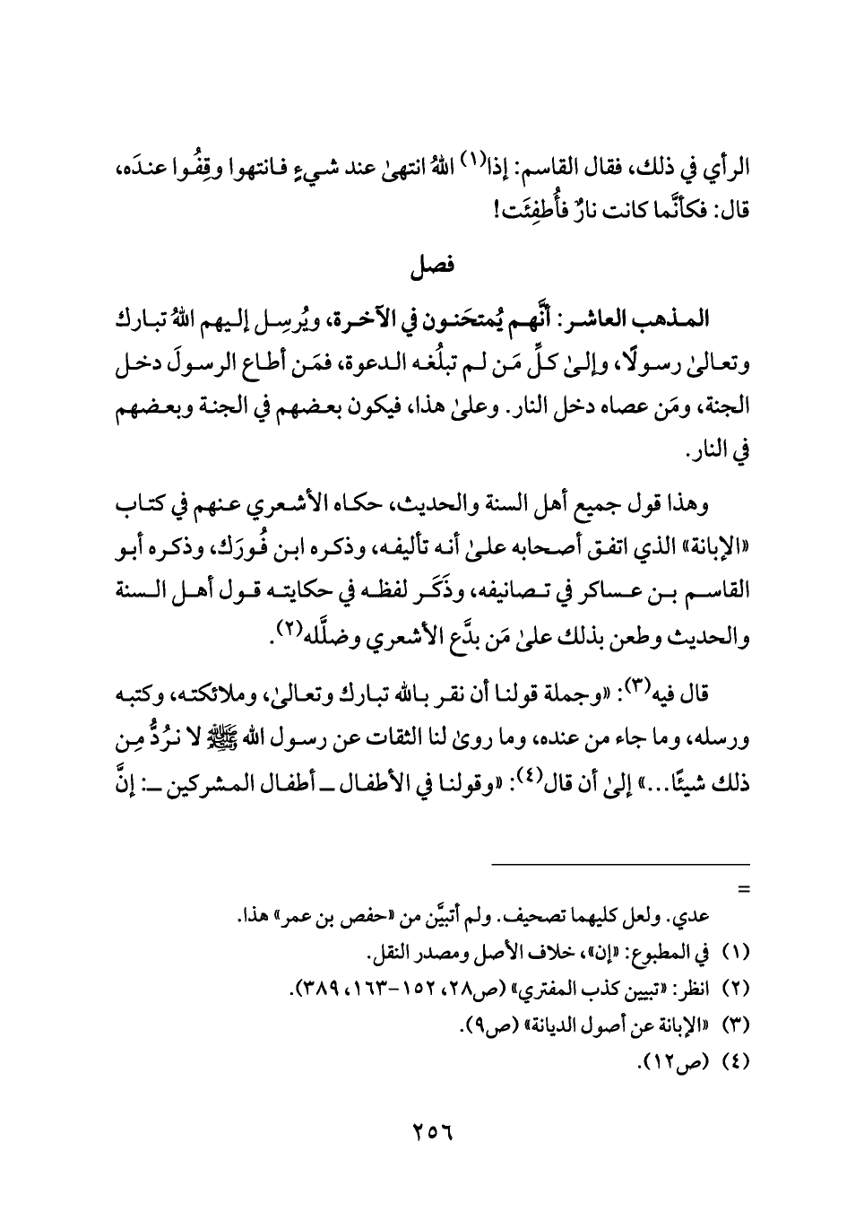 قال فيه (¬٣): «وجملة قولنا أن نقر بالله تبارك وتعالى، وملائكته، وكتبه ورسله، وما جاء من عنده، وما روى لنا الثقات عن رسول الله - صلى الله عليه وسلم - لا نرُدُّ مِن ذلك شيئًا ... » إلى أن قال (¬٤): «وقولنا في الأطفال ــ أطفال المشركين ــ: إنَّ