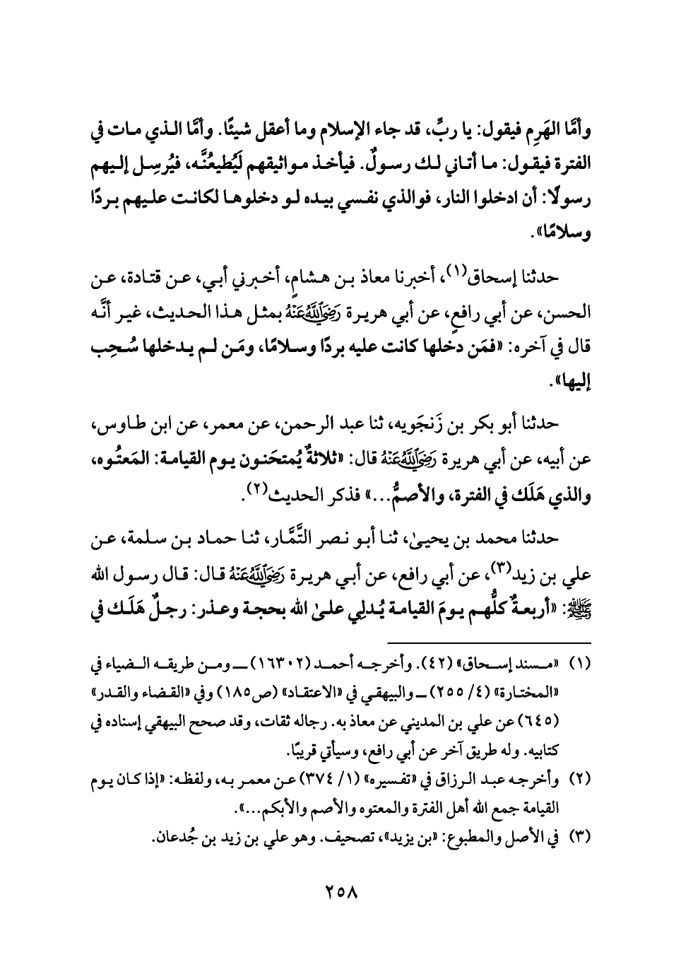 حدثنا أبو بكر بن زَنجَويه، ثنا عبد الرحمن، عن معمر، عن ابن طاوس، عن أبيه، عن أبي هريرة - رضي الله عنه - قال: «ثلاثةٌ يُمتحَنون يوم القيامة: المَعتُوه، والذي هَلَك في الفترة، والأصمُّ ... » فذكر الحديث (¬٢).