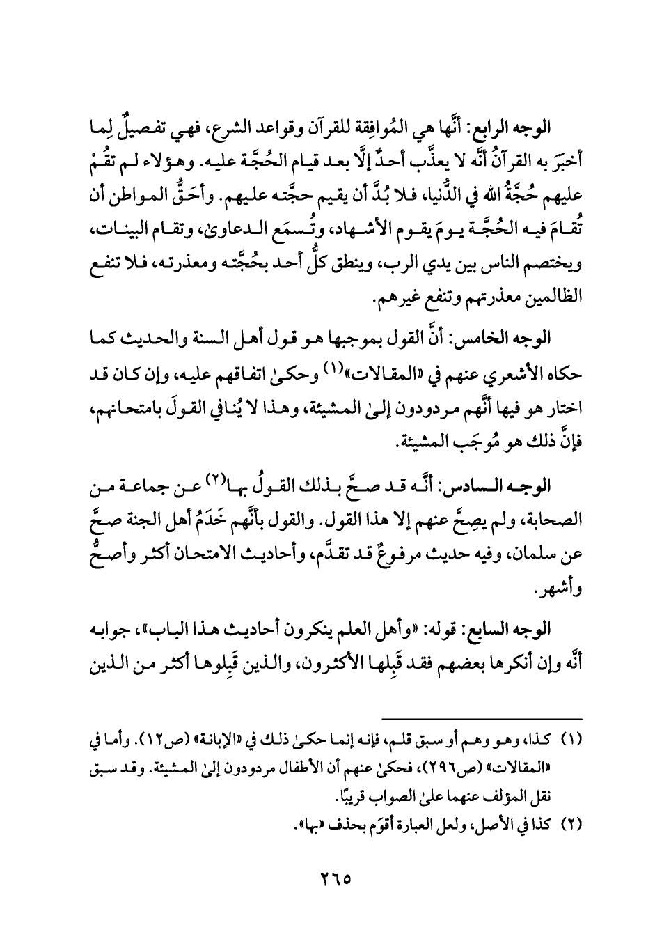 الوجه الرابع: أنَّها هي المُوافِقة للقرآن وقواعد الشرع، فهي تفصيلٌ لِما أخبَرَ به القرآنُ أنَّه لا يعذَّب أحدٌ إلَّا بعد قيام الحُجَّة عليه. وهؤلاء لم تقُمْ عليهم حُجَّةُ الله في الدُّنيا، فلا بُدَّ أن يقيم حجَّته عليهم. وأحَقُّ المواطن أن تُقامَ فيه الحُجَّة يومَ يقوم الأشهاد، وتُسمَع الدعاوى، وتقام البينات، ويختصم الناس بين يدي الرب، وينطق كلُّ أحد بحُجَّته ومعذرته، فلا تنفع الظالمين معذرتهم وتنفع غيرهم.
