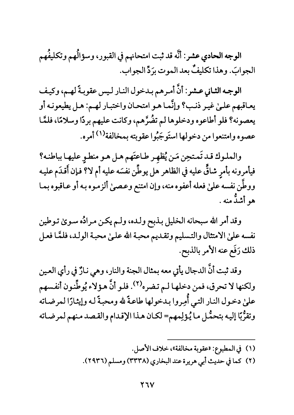 الوجه الثاني عشر: أنَّ أمرهم بدخول النار ليس عقوبةً لهم، وكيف يعاقبهم على غير ذنب؟ وإنَّما هو امتحان واختبار لهم: هل يطيعونه أو يعصونه؟ فلو أطاعوه ودخلوها لم تضُرَّهم، وكانت عليهم بردًا وسلامًا، فلمَّا عصوه وامتنعوا من دخولها استَوجَبُوا عقوبته بمخالفة (¬١) أمره.