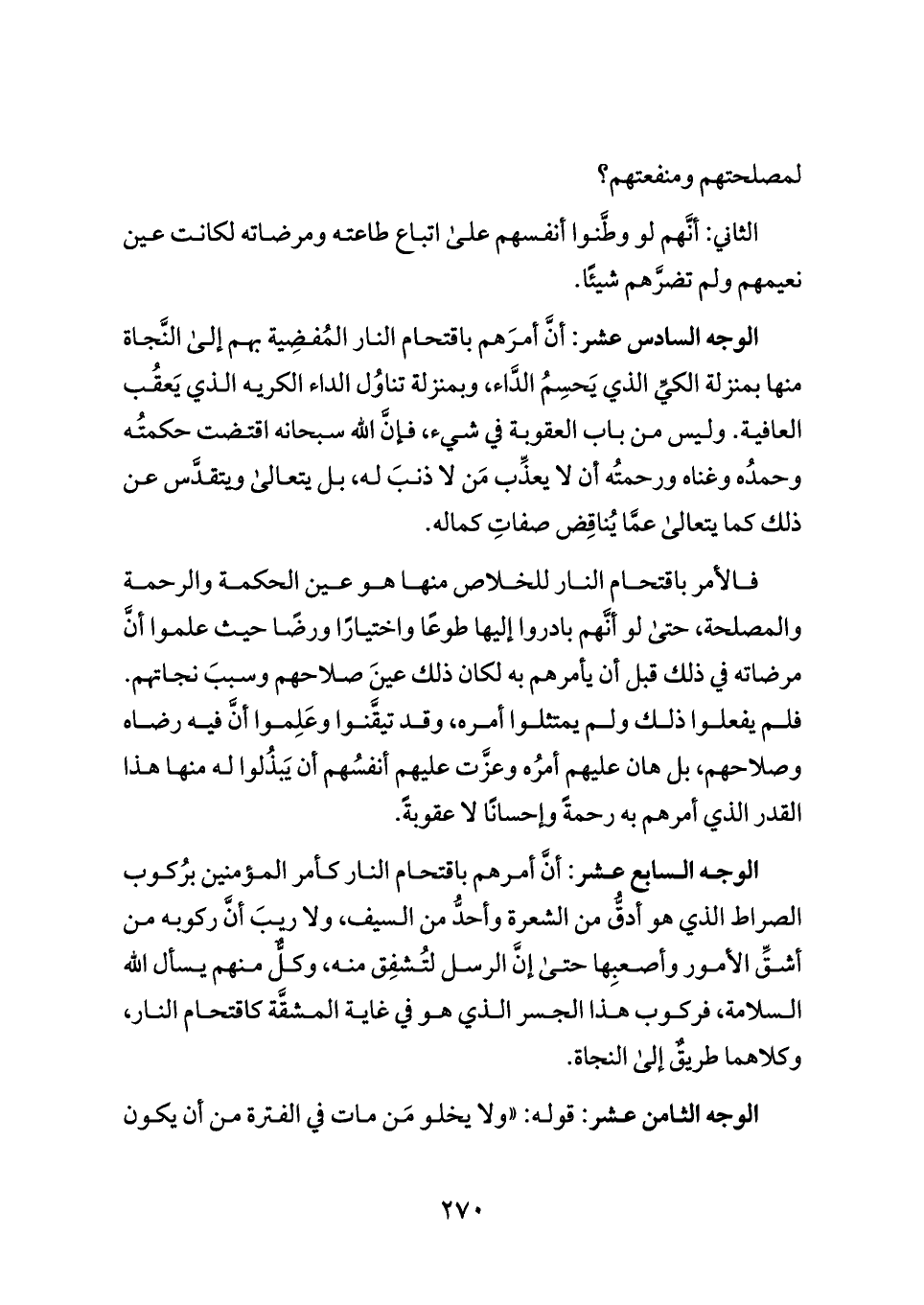 الوجه السابع عشر: أنَّ أمرهم باقتحام النار كأمر المؤمنين برُكوب الصراط الذي هو أدقُّ من الشعرة وأحدُّ من السيف، ولا ريبَ أنَّ ركوبه من أشقِّ الأمور وأصعبِها حتى إنَّ الرسل لتُشفِق منه، وكلٌّ منهم يسأل الله السلامة، فركوب هذا الجسر الذي هو في غاية المشقَّة كاقتحام النار، وكلاهما طريقٌ إلى النجاة.