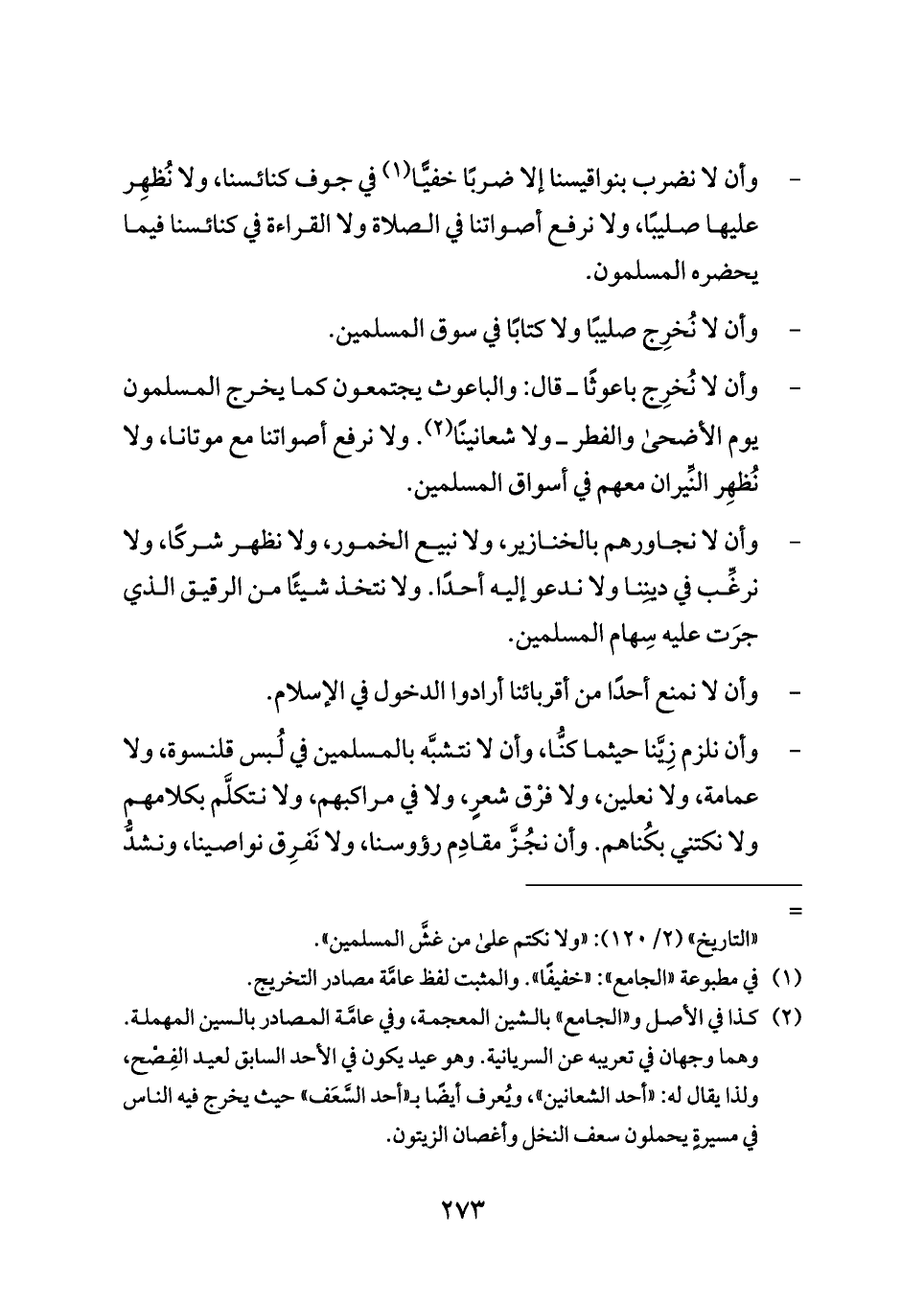 - وأن لا نجاورهم بالخنازير، ولا نبيع الخمور، ولا نظهر شركًا، ولا نرغِّب في دينِنا ولا ندعو إليه أحدًا. ولا نتخذ شيئًا من الرقيق الذي جرَت عليه سِهام المسلمين.