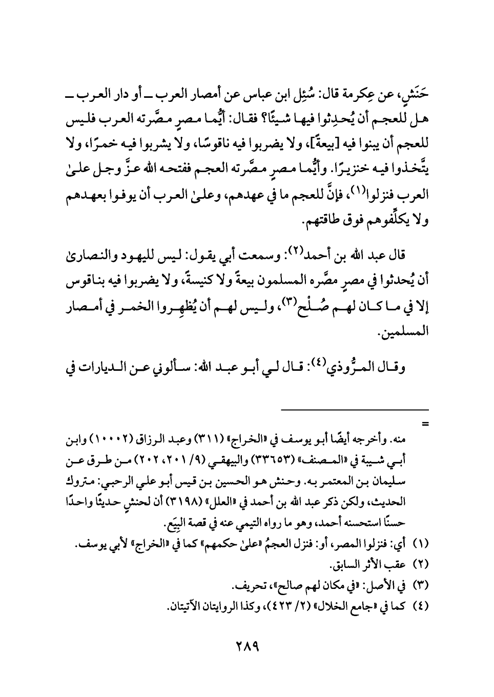 حَنَشٍ، عن عِكرمة قال: سُئِل ابن عباس عن أمصار العرب ــ أو دار العرب ــ هل للعجم أن يُحدِثوا فيها شيئًا؟ فقال: أيُّما مصرٍ مصَّرته العرب فليس للعجم أن يبنوا فيه [بيعةً]، ولا يضربوا فيه ناقوسًا، ولا يشربوا فيه خمرًا، ولا يتَّخذوا فيه خنزيرًا. وأيُّما مصرٍ مصَّرته العجم ففتحه الله عزَّ وجل على العرب فنزلوا (¬١)، فإنَّ للعجم ما في عهدهم، وعلى العرب أن يوفوا بعهدهم ولا يكلِّفوهم فوق طاقتهم.
