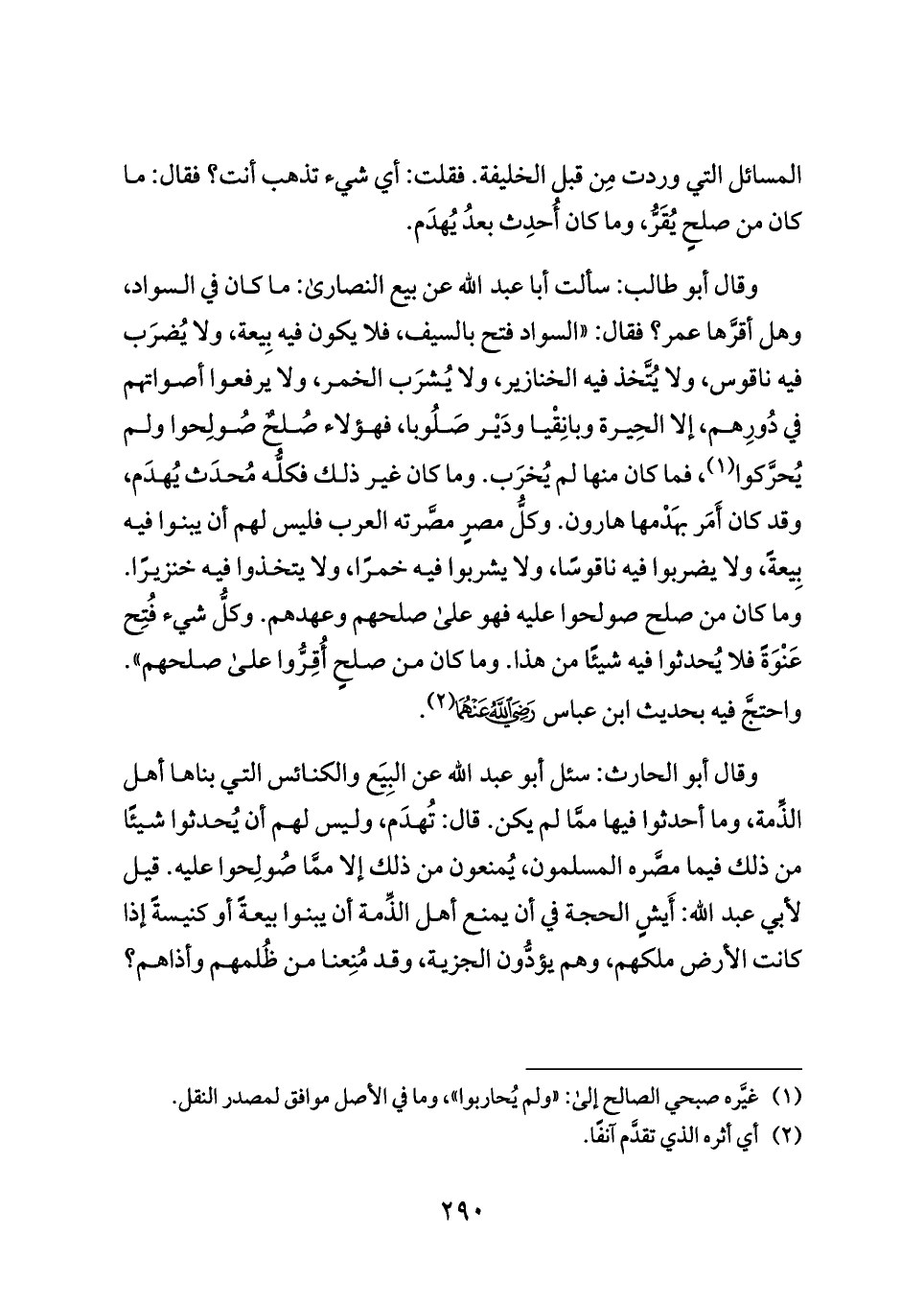 وقال أبو طالب: سألت أبا عبد الله عن بيع النصارى: ما كان في السواد، وهل أقرَّها عمر؟ فقال: «السواد فتح بالسيف، فلا يكون فيه بِيعة، ولا يُضرَب فيه ناقوس، ولا يُتَّخذ فيه الخنازير، ولا يُشرَب الخمر، ولا يرفعوا أصواتهم في دُورِهم، إلا الحِيرة وبانِقْيا ودَيْر صَلُوبا، فهؤلاء صُلحٌ صُولِحوا ولم يُحرَّكوا (¬١)، فما كان منها لم يُخرَب. وما كان غير ذلك فكلُّه مُحدَث يُهدَم، وقد كان أَمَر بهَدْمها هارون. وكلُّ مصرٍ مصَّرته العرب فليس لهم أن يبنوا فيه بِيعةً، ولا يضربوا فيه ناقوسًا، ولا يشربوا فيه خمرًا، ولا يتخذوا فيه خنزيرًا. وما كان من صلح صولحوا عليه فهو على صلحهم وعهدهم. وكلُّ شيء فُتِح عَنْوَةً فلا يُحدثوا فيه شيئًا من هذا. وما كان من صلحٍ أُقِرُّوا على صلحهم». واحتجَّ فيه بحديث ابن عباس - رضي الله عنهما - (¬٢).